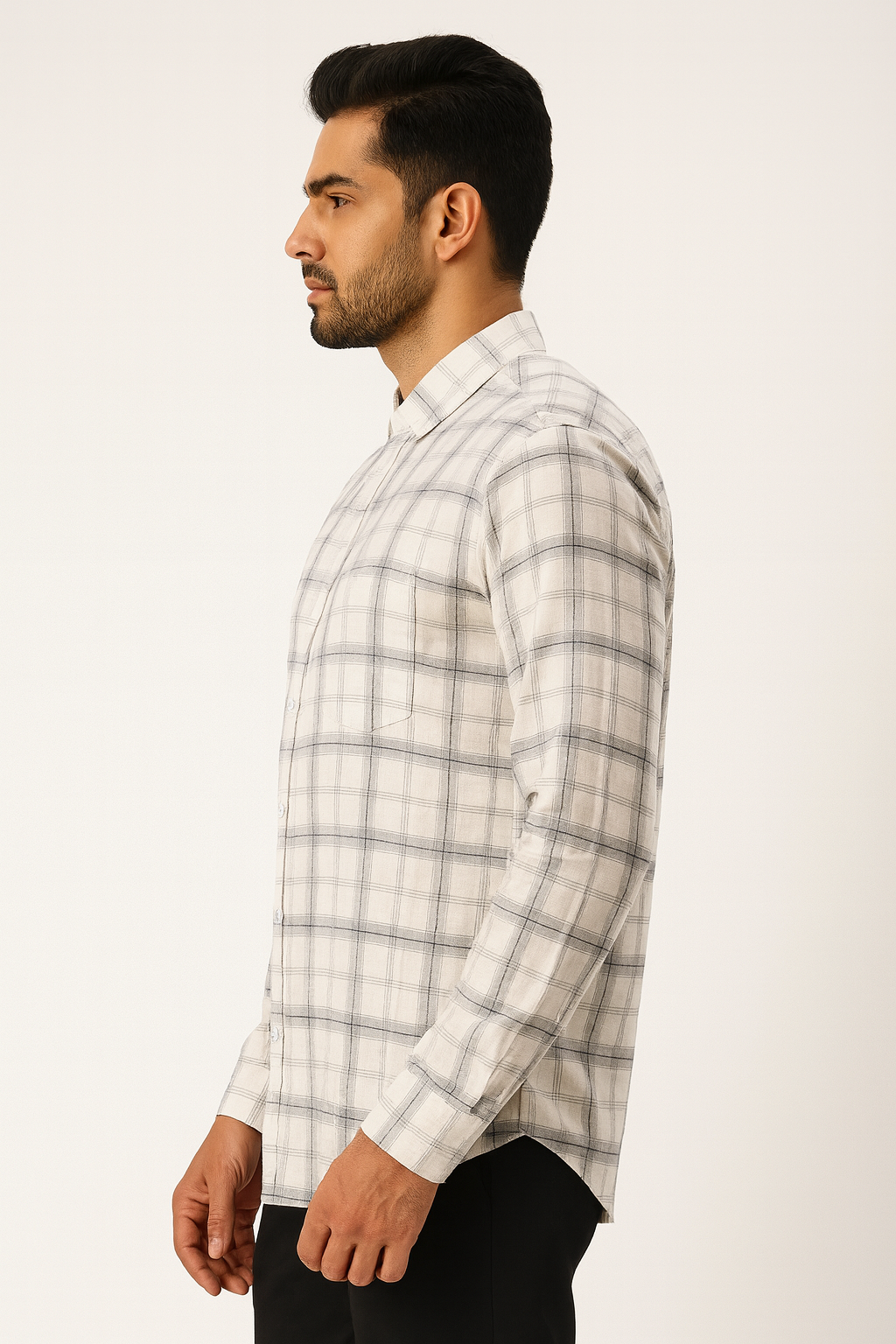 A classic slim-fit cotton shirt in beige with subtle grey checks. Perfect for work, casual days, or weekend outings.