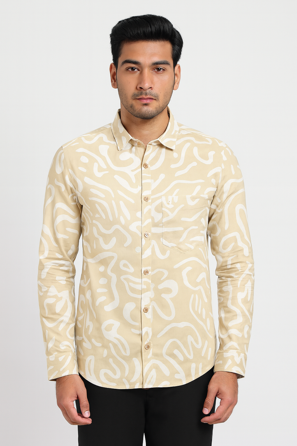 Add a touch of modern artistry to your wardrobe with this beige cotton shirt featuring bold white abstract prints. With its sharp collar, button-down design, and comfortable long sleeves, this shirt is perfect for making a stylish statement at casual gatherings, outings, or weekend events. The lightweight cotton fabric ensures all-day comfort and breathability.