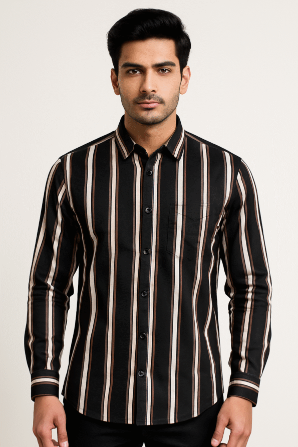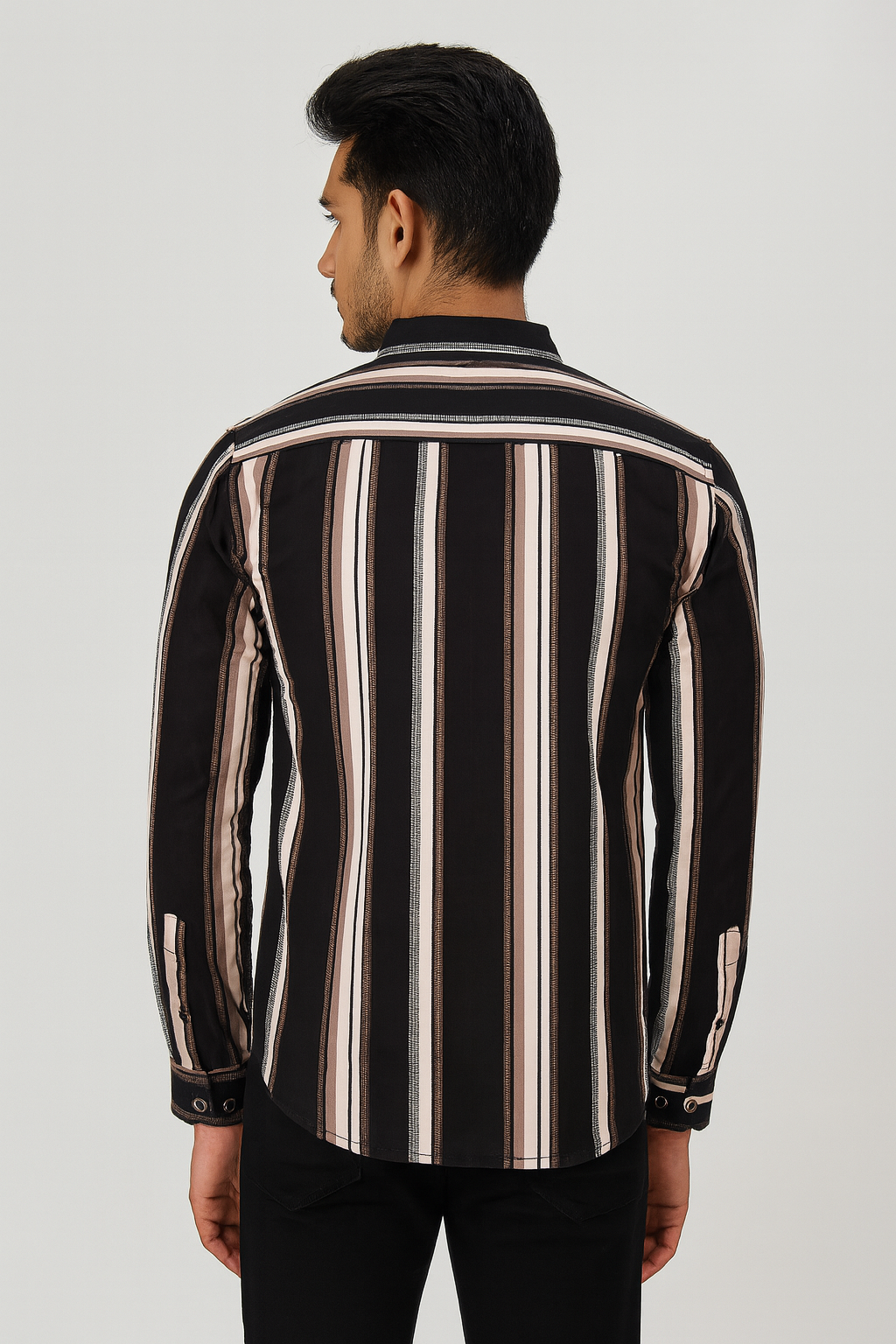 Black cotton shirt with beige & white vertical stripes – sleek and stylish everyday wear.
