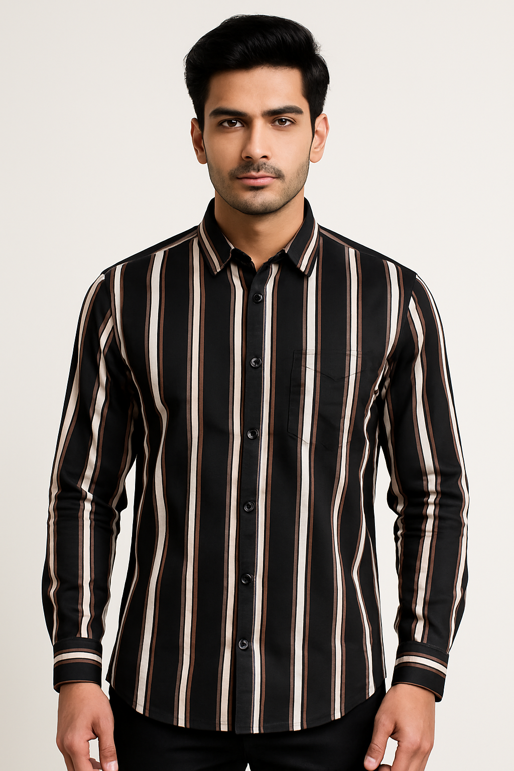 Elevate your smart-casual look with this black cotton shirt featuring bold beige and white vertical stripes. Designed with a crisp collar, button-down front, and full sleeves, this shirt strikes the perfect balance between sophistication and comfort. The breathable cotton fabric makes it an ideal choice for both workdays and evening outings. Pair it with chinos or jeans for a versatile style statement.