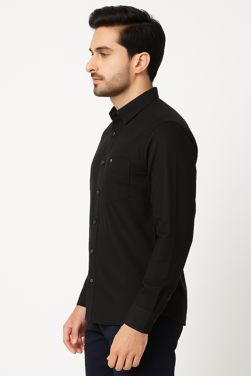 A sleek and stylish solid black shirt crafted from a soft cotton-blend fabric. Featuring a full-sleeve design, button-down closure, and a front pocket with minimal branding—ideal for both formal and casual occasions.