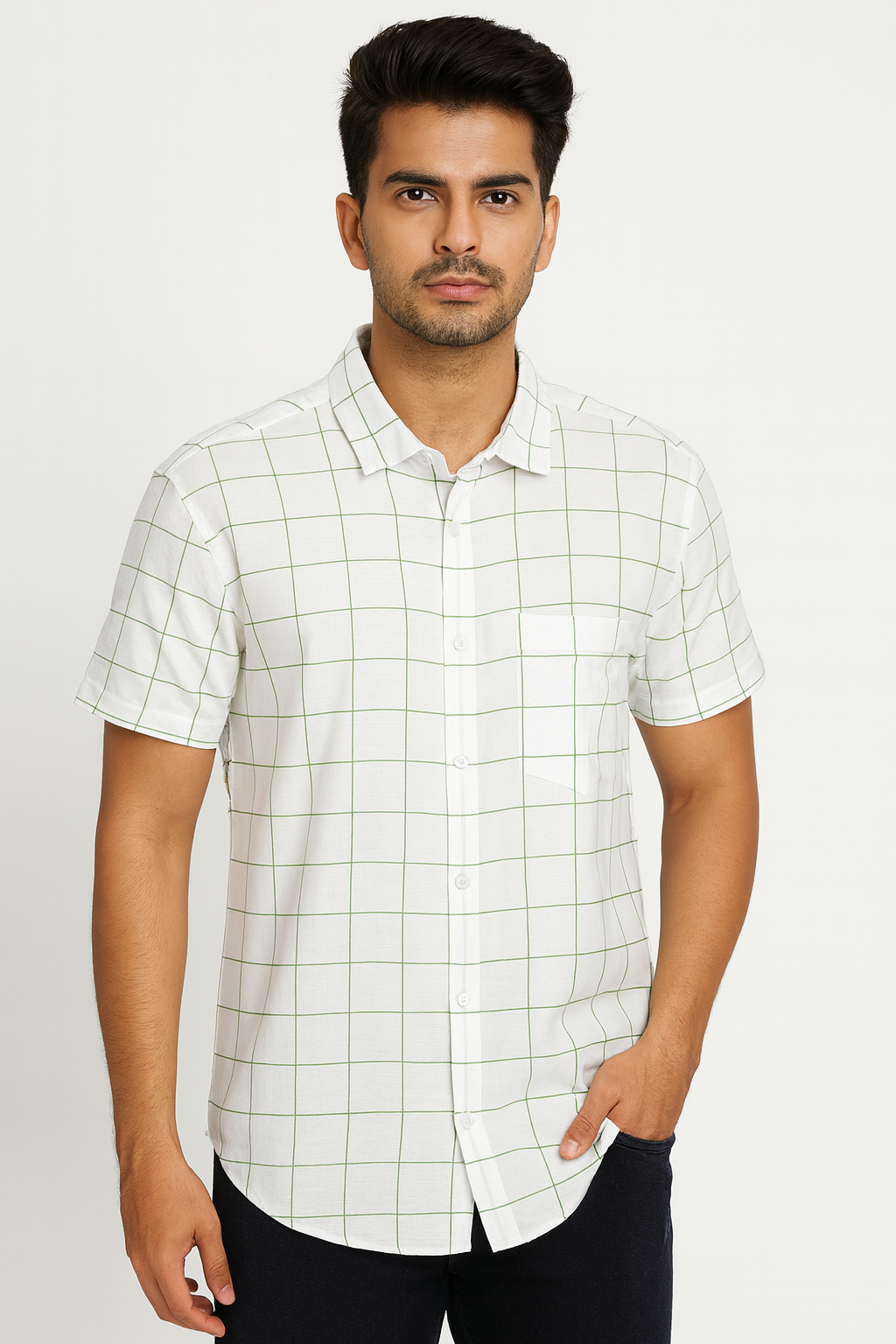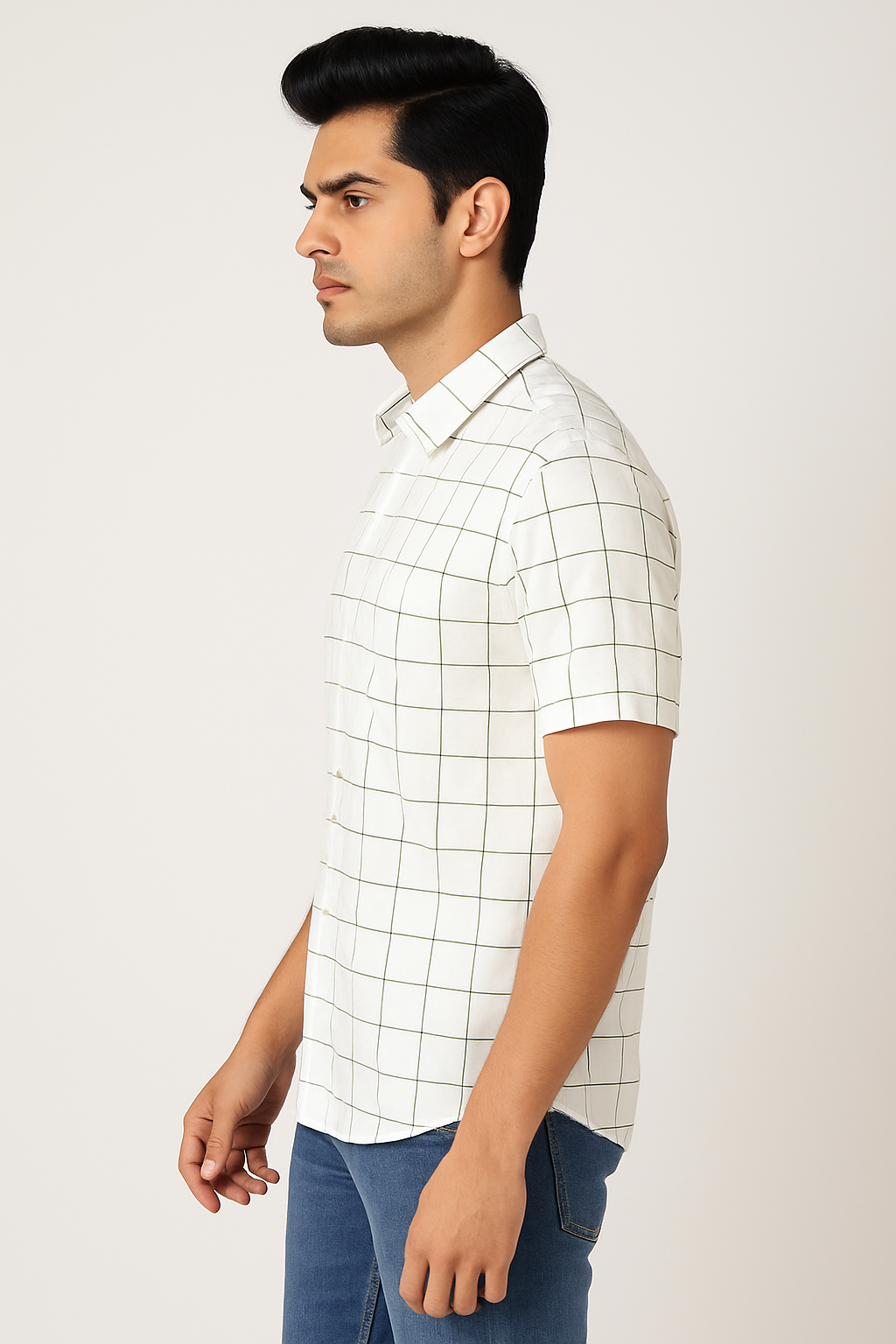 A crisp white short sleeve shirt with minimal green grid checks, designed for a clean and versatile look.
