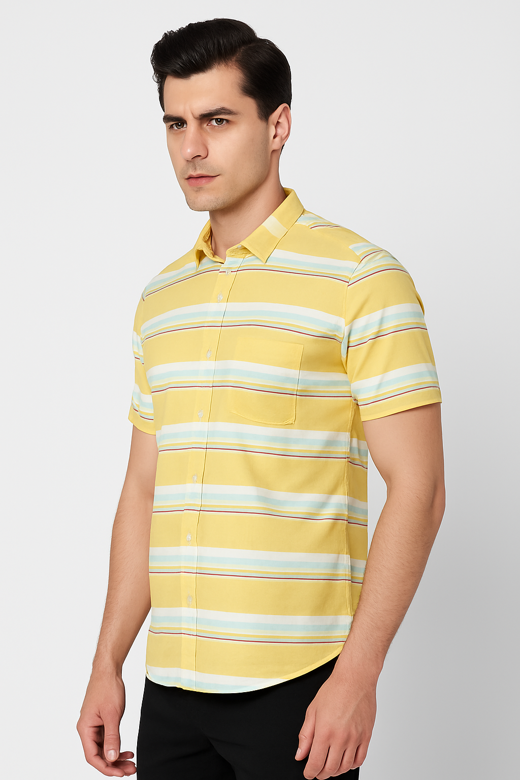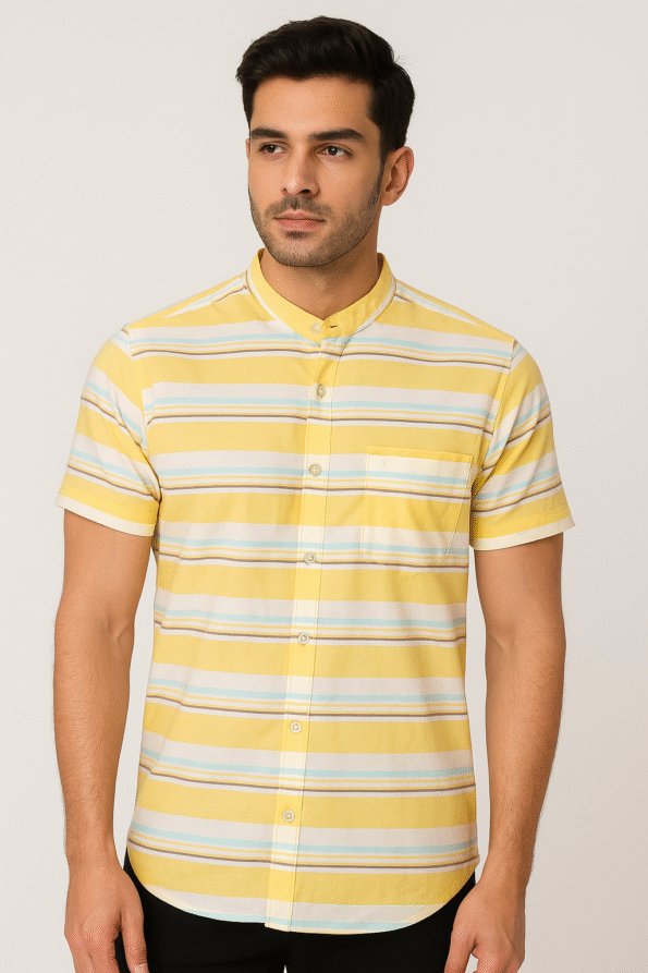 A breathable short-sleeve shirt in soft yellow with white, aqua, and brown stripes, featuring a modern mandarin collar, button placket, and chest pocket—perfect for smart-casual summer wear.
