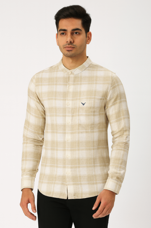 A breathable short-sleeve shirt in beige and white checks with a classic collar, full button placket, and chest pocket—perfect for easy smart-casual dressing in warm weather.