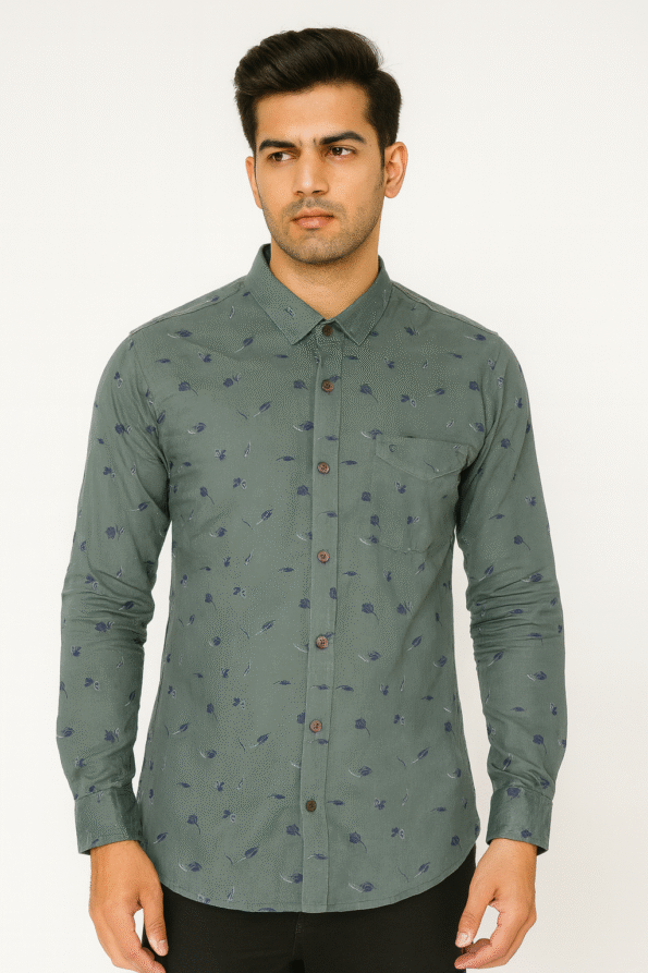 Upgrade your everyday style with this green printed slim-fit casual shirt. Crafted from premium breathable cotton fabric, this shirt features a subtle all-over leaf print that adds a touch of sophistication to your look. Designed with a classic spread collar, button-down front, and a functional chest pocket, it combines comfort with modern fashion. Perfect for both casual outings and semi-formal occasions, this shirt pairs effortlessly with jeans, chinos, or trousers.