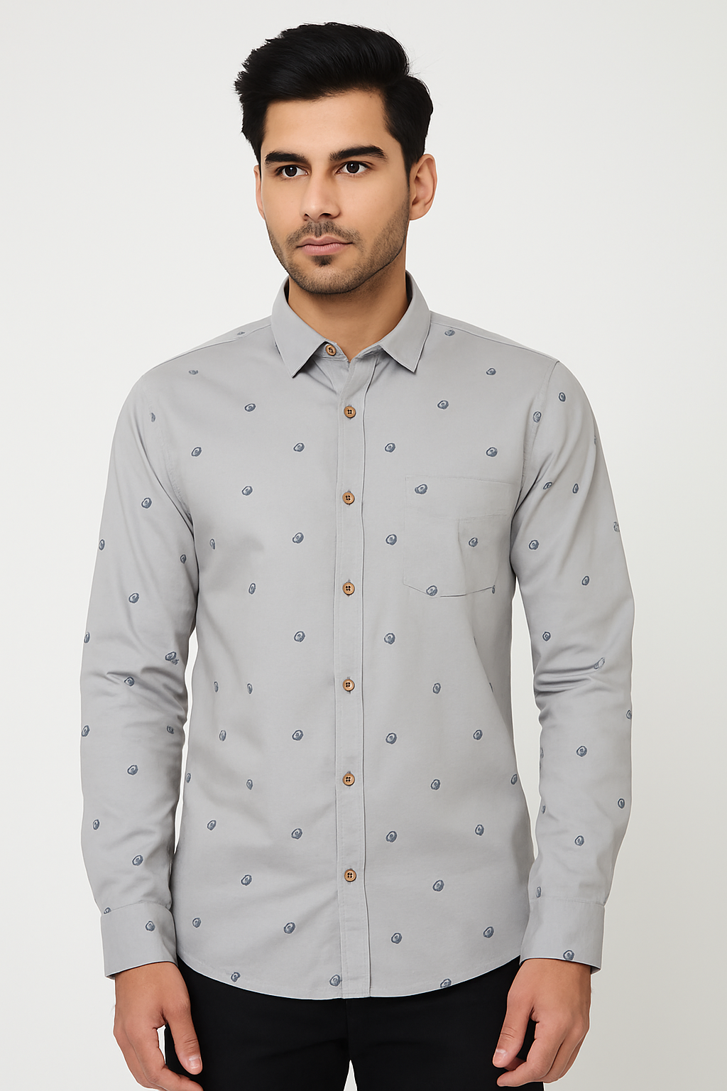 This casual shirt elevates everyday style with a clean grey base accented by understated navy micro motifs, offering visual interest while staying versatile. The classic collar, tailored sleeves, and contrast wooden-tone buttons create a refined silhouette that pairs easily with black chinos or dark denim. Crafted from smooth, breathable fabric, it delivers day-long comfort and a crisp finish for office-casual days, dinners, and social outings.