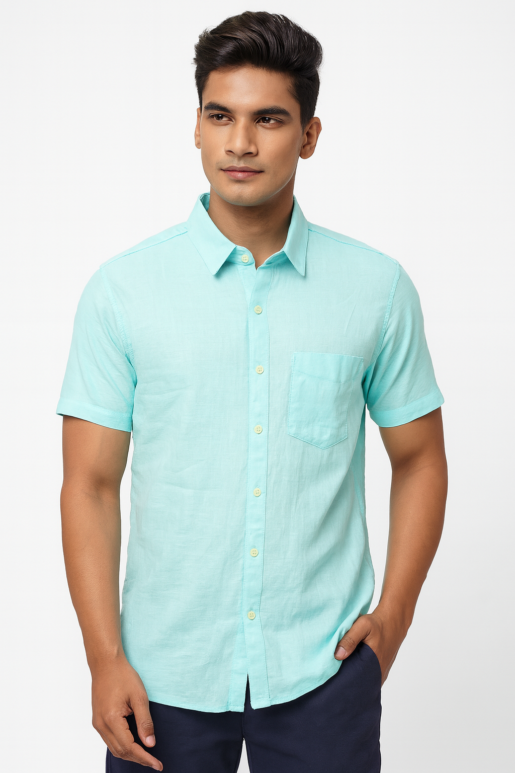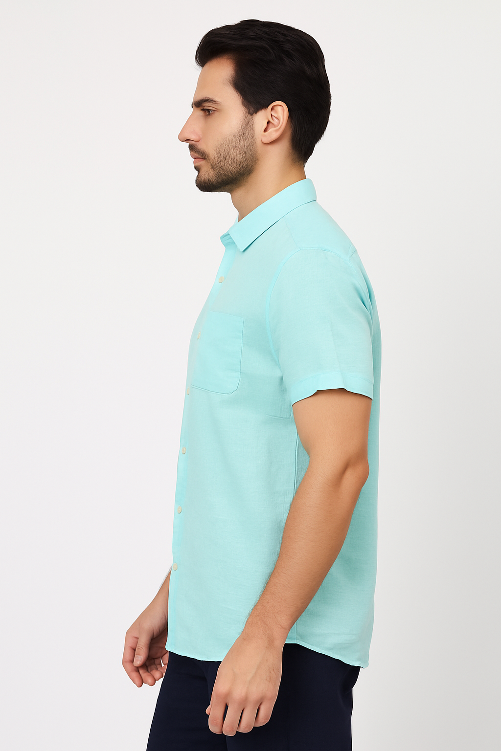 A refreshing aqua blue short-sleeve shirt with a clean, solid design for a crisp summer look.