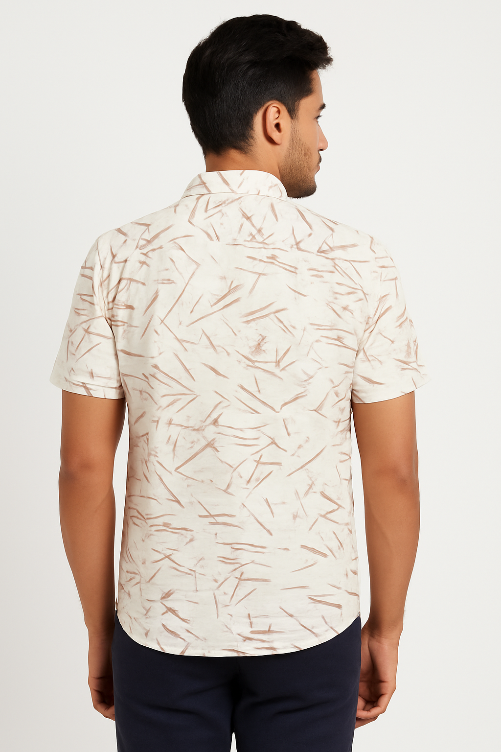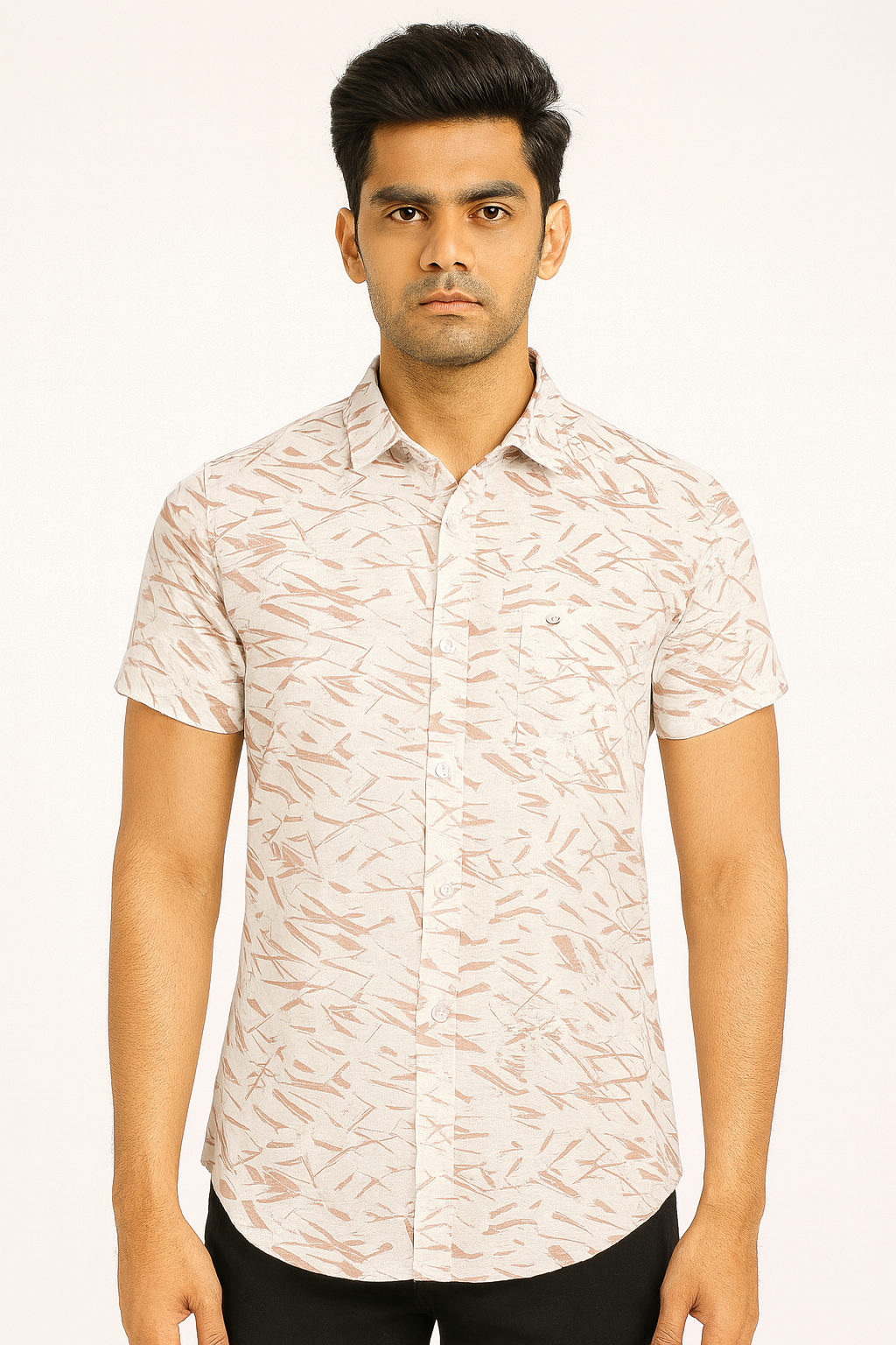 A stylish blend of subtlety and modern flair — this beige short sleeve shirt features an all-over abstract print in light brown tones. Crafted from breathable cotton fabric, it offers a perfect balance between comfort and fashion, making it ideal for casual outings or smart-casual Fridays.