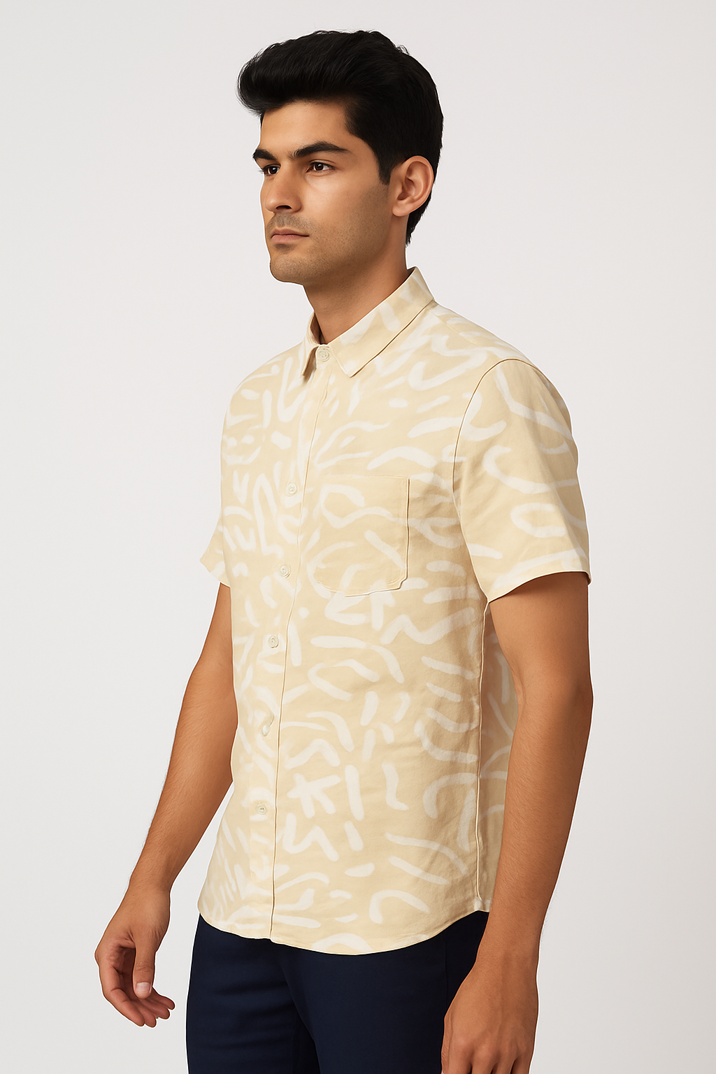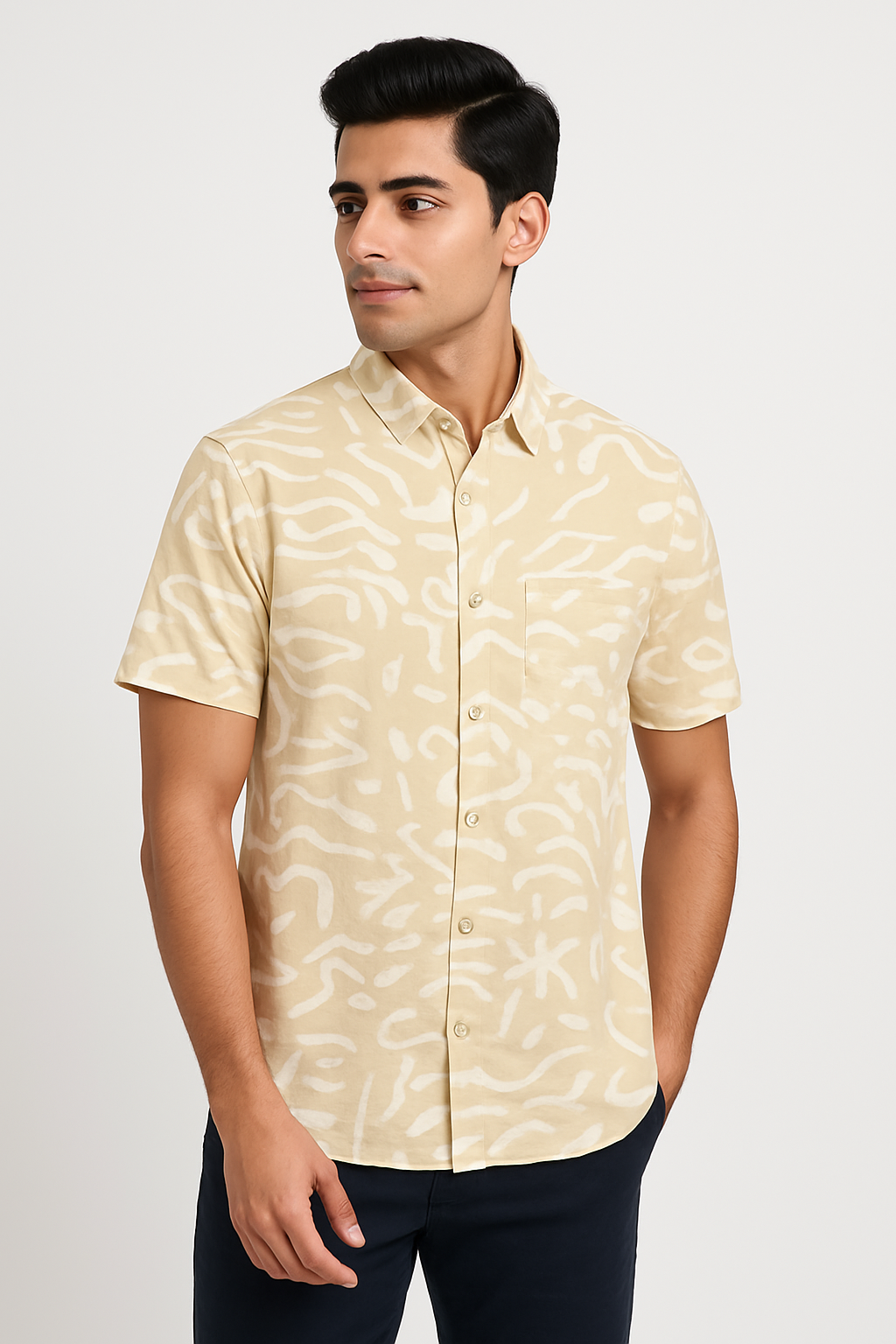 Elevate your casual wardrobe with this beige short sleeve shirt featuring a subtle all-over abstract print. Designed with a classic spread collar and button-down front, this shirt blends contemporary style with everyday comfort. Crafted from soft, breathable fabric, it ensures you stay cool and stylish all day long. The neutral beige tone paired with the abstract white pattern makes it versatile for pairing with jeans, chinos, or shorts for an effortlessly sharp look.