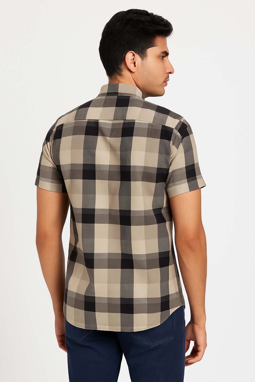 Refresh your wardrobe with this beige and black checked short sleeve shirt, designed for effortless everyday style. The bold checkered pattern gives it a modern yet classic appeal, while the tailored fit and button-down front maintain a sharp, structured look. Made from breathable, soft-touch fabric, this shirt ensures all-day comfort whether you’re heading out for a casual outing, meeting friends, or enjoying a laid-back weekend. Pair it with jeans for a casual vibe or chinos for a smart-casual upgrade.