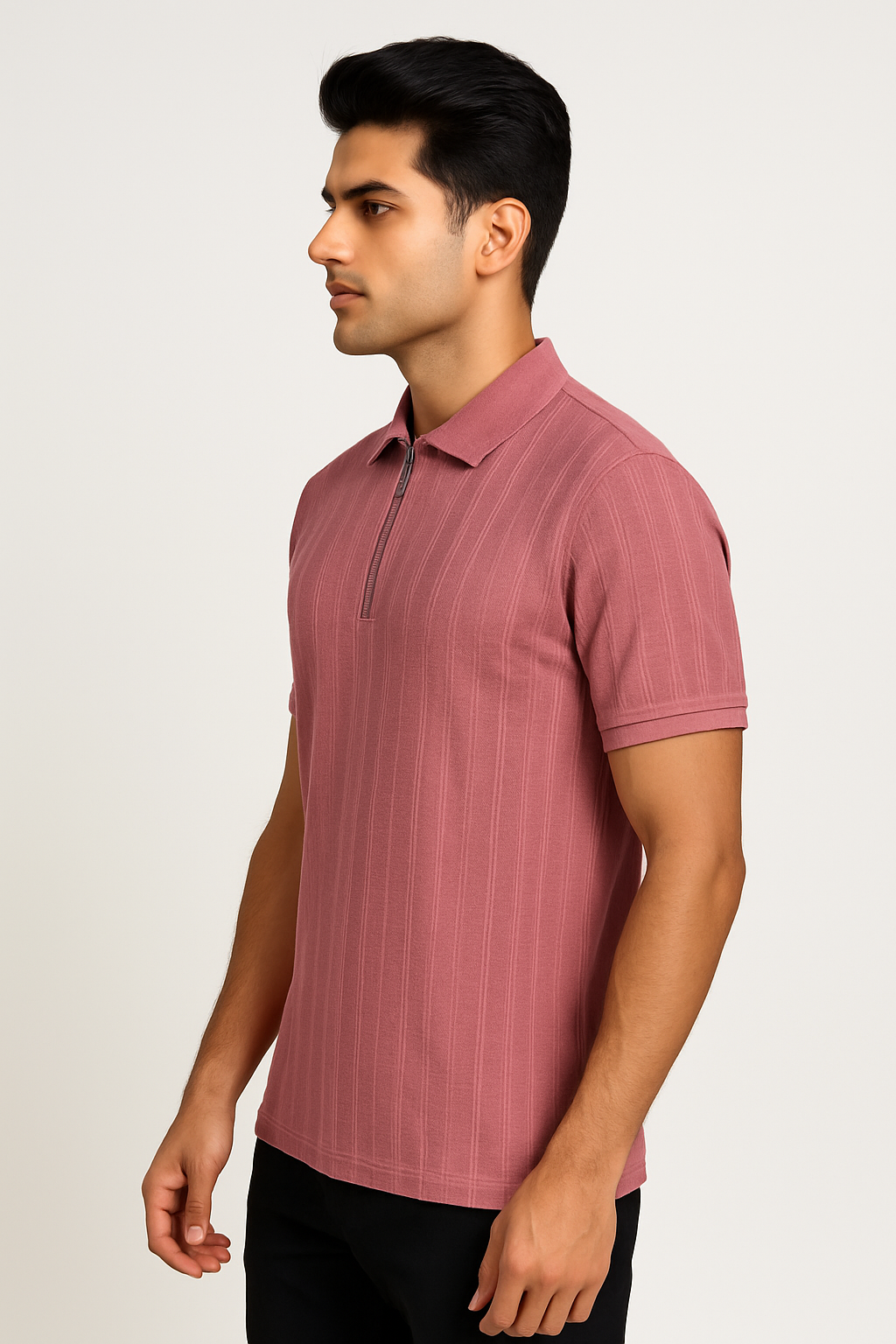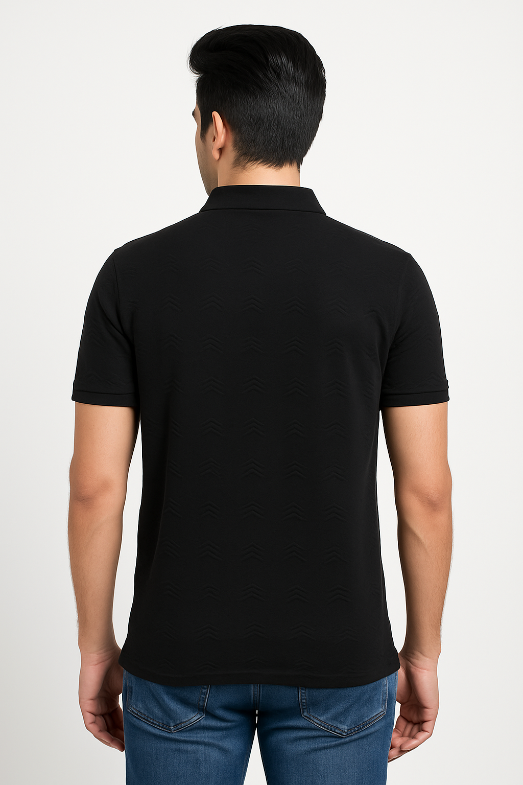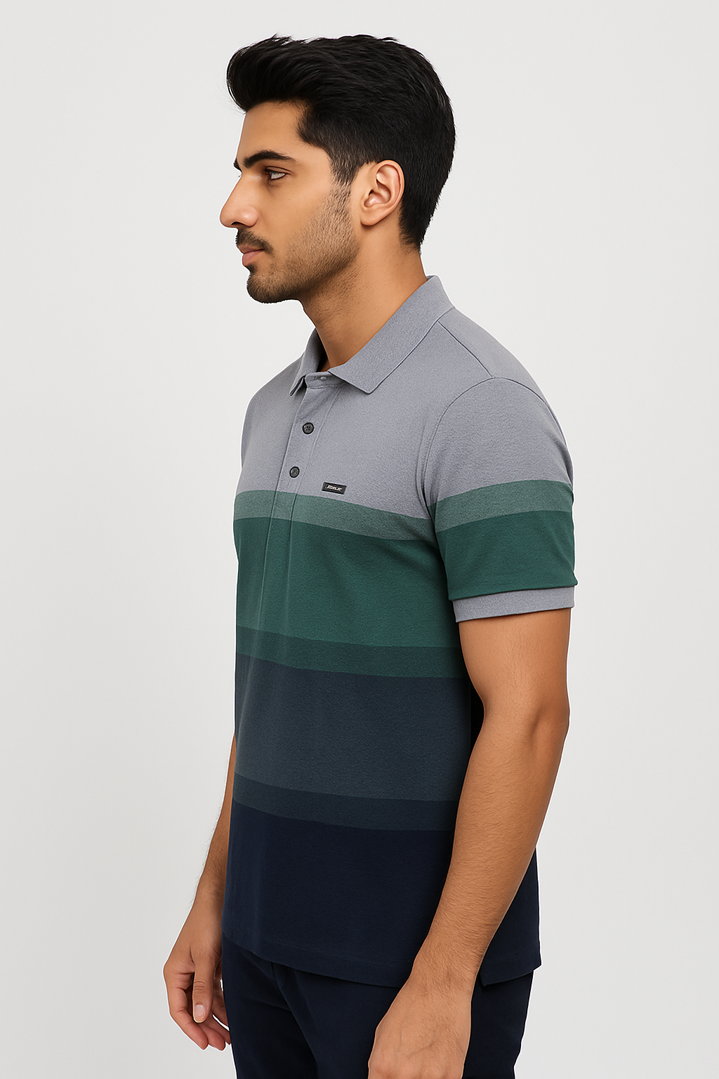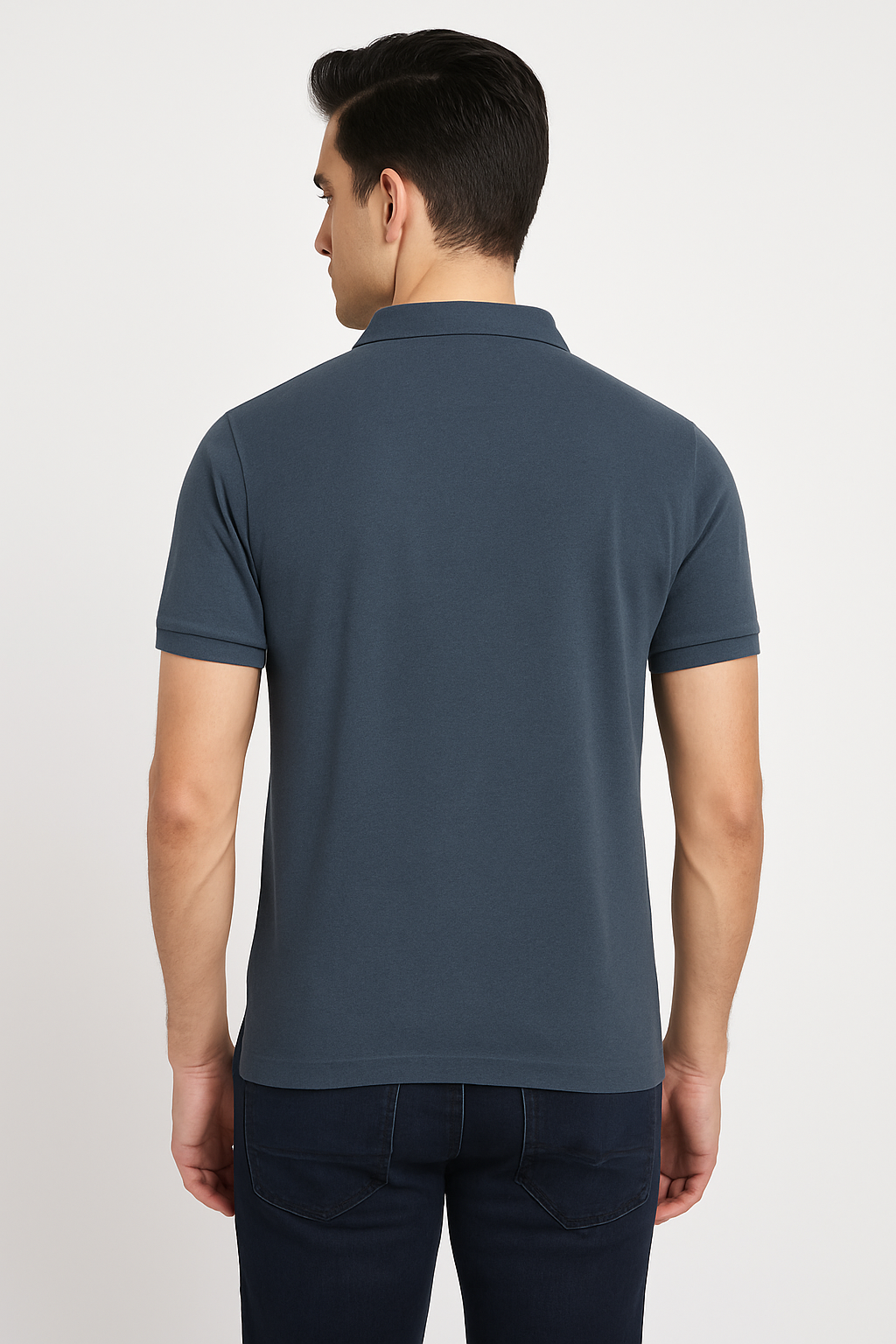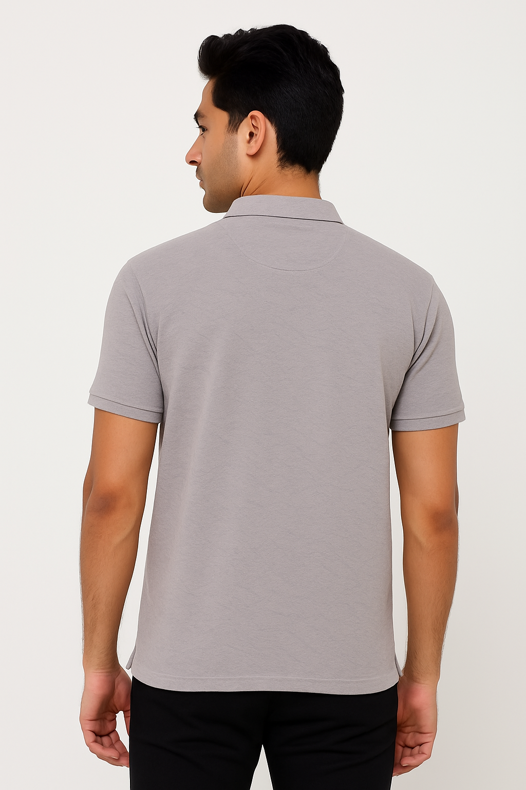 A modern grey Henley polo with a sleek mandarin collar and three-button placket. Made from smooth, soft-stretch fabric for all-day comfort, it features subtle chest branding and navy-tipped sleeves. A clean, versatile piece that pairs easily with jeans or chinos for smart-casual wear