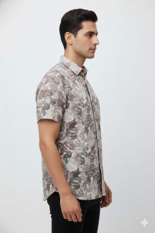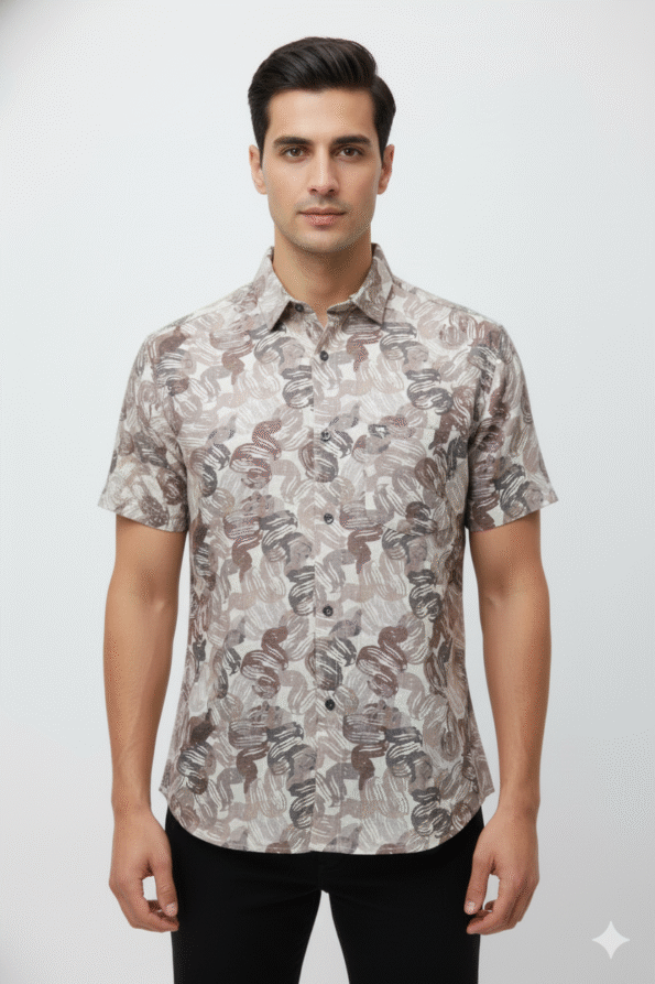 This men’s short-sleeve casual shirt blends artistic design with refined comfort. Featuring a soft beige base with brown and charcoal brushstroke patterns, it delivers a modern yet earthy aesthetic. The shirt is tailored from lightweight, breathable fabric that ensures comfort in warm weather while maintaining a polished silhouette. Ideal for casual Fridays, weekend brunches, or evening gatherings, this versatile shirt pairs effortlessly with chinos or denim for a balanced, sophisticated look.