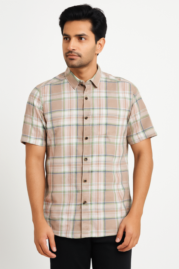 Upgrade your casual collection with this beige checked shirt featuring a refreshing mix of green, white, and subtle blue lines. Designed with short sleeves and a button-down front, it offers a relaxed yet smart look. The breathable cotton fabric ensures comfort, making it ideal for everyday wear, casual outings, or weekend get-togethers. Pair it with jeans, chinos, or shorts for versatile styling.