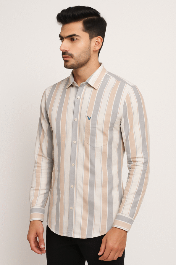 Elevate your everyday style with this beige and grey striped shirt. Featuring vertical stripes in beige, grey, and white tones, it creates a slimming and sharp look. Designed with a button-down front, chest pocket with embroidered logo, and full sleeves, it’s ideal for both casual and semi-formal dressing.