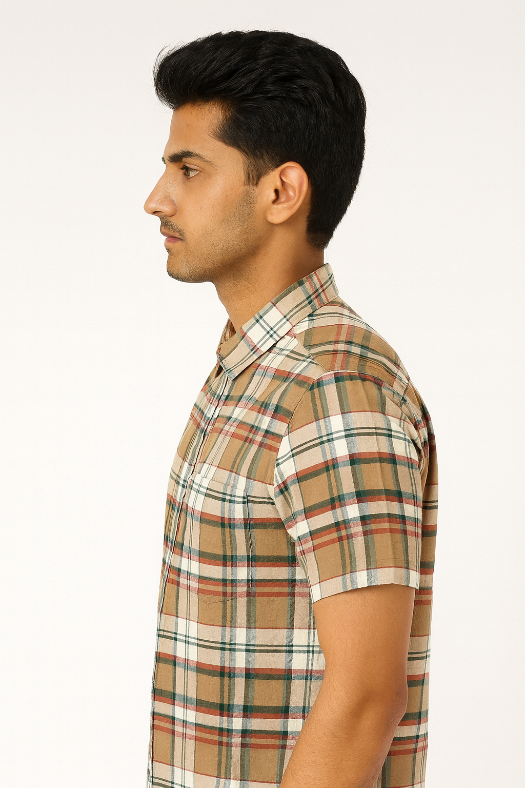 A stylish beige short-sleeve shirt featuring multicolor checks in green, red, and white, complete with a button-up front and chest pocket for casual flair.