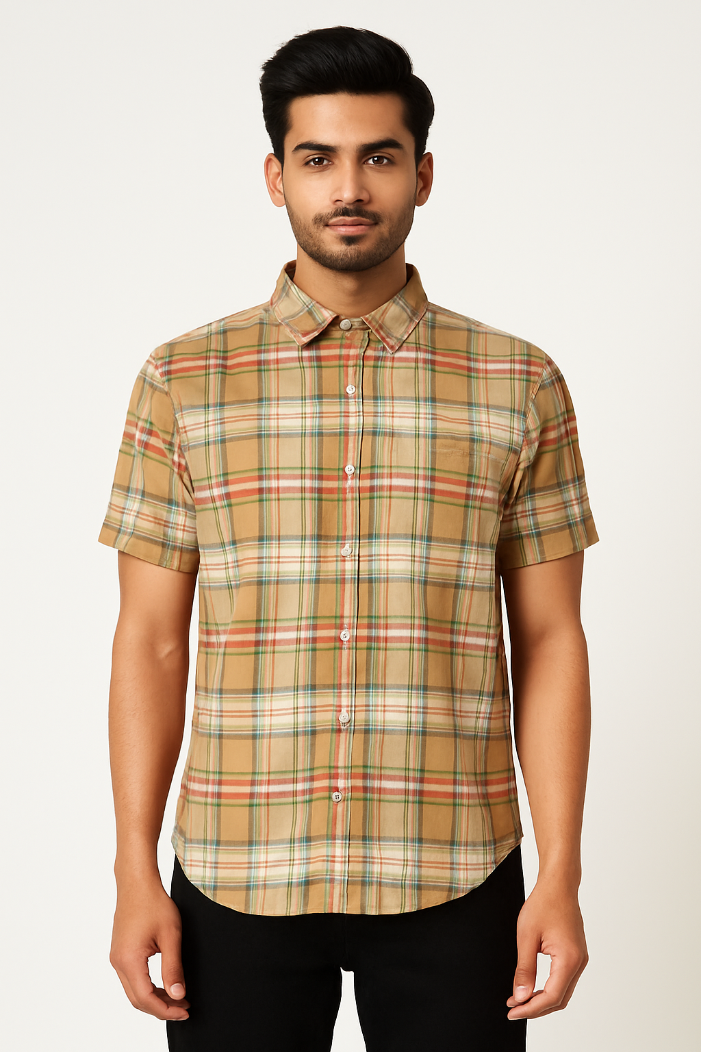 Bring a touch of vibrance to your wardrobe with this men’s beige checked short-sleeve shirt. Designed with multicolor check patterns in green, red, and white, this shirt blends earthy tones with a lively style. Crafted from breathable, lightweight fabric, it’s perfect for casual outings, everyday wear, or weekend gatherings. The shirt comes with a collared neckline, button-up front, and chest pocket, offering a balance of functionality and relaxed charm. Pair it with black trousers for a clean look or jeans for a casual, rugged vibe.