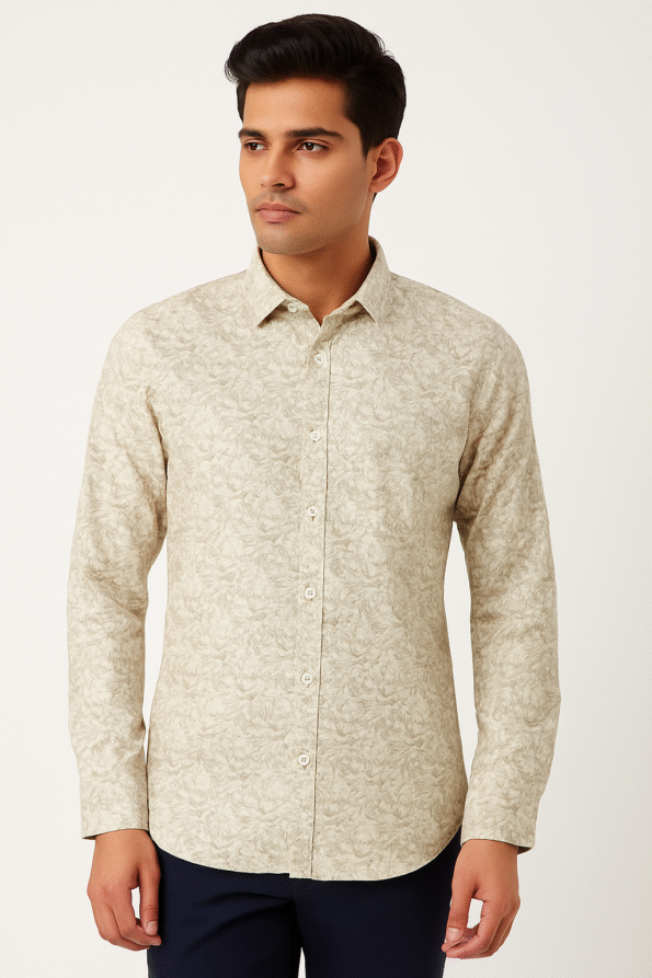 A stylish beige long sleeve shirt with a soft textured print — perfect for elegant casual or semi-formal wear.