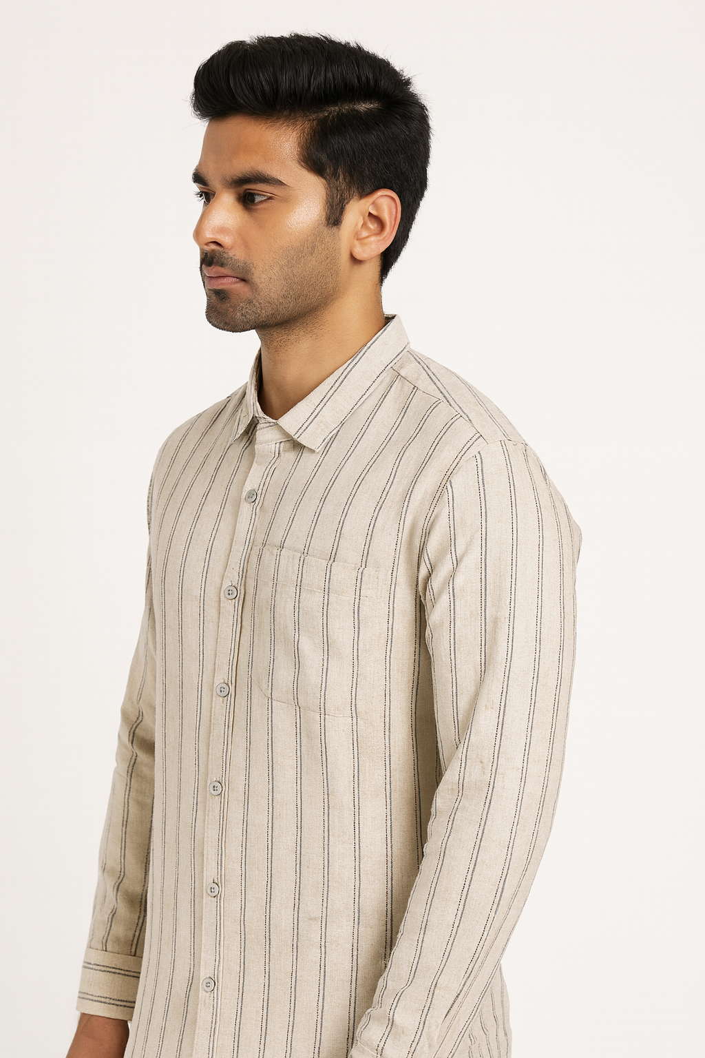 A stylish beige shirt featuring subtle vertical stripes — perfect for a clean, smart, and versatile everyday look.