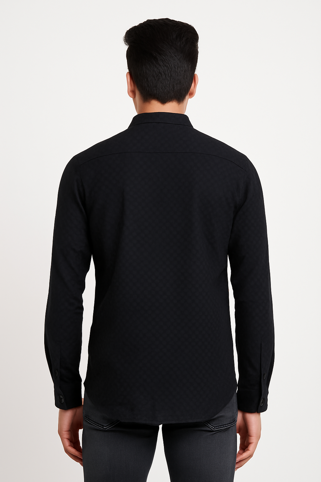 Add a touch of sophistication with this black slim fit shirt featuring a subtle diamond checkered pattern. Designed with a full-button placket, long sleeves, and a chest pocket highlighted by a white embroidered logo, this shirt strikes the perfect balance between formal elegance and casual versatility. The soft fabric ensures comfort, making it ideal for office wear, parties, or evening outings. Pair with dark chinos or formal trousers for a refined look.