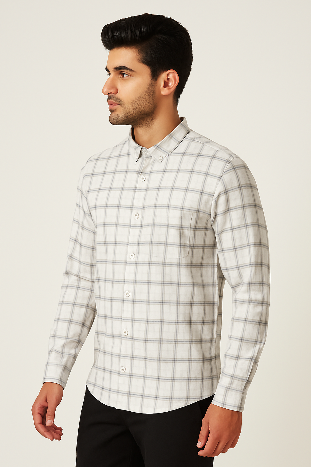 Refresh your wardrobe with this Men’s White & Grey Checked Slim Fit Casual Shirt, crafted to deliver timeless elegance with a modern twist. The soft white base paired with understated grey checks creates a clean and versatile look suitable for both work and casual outings.