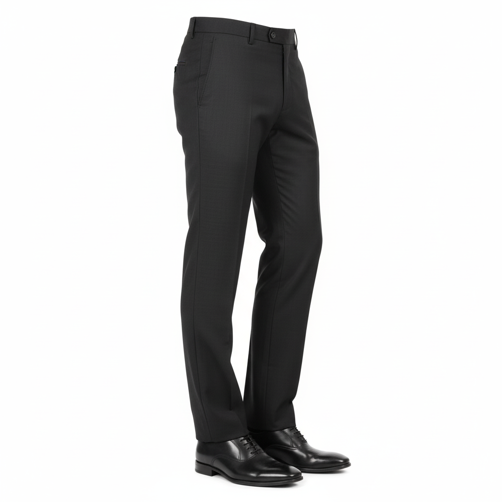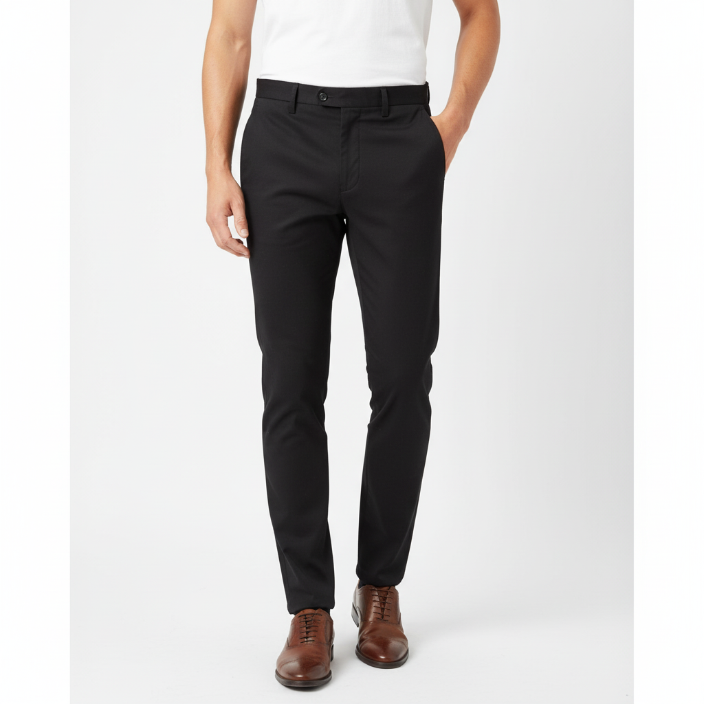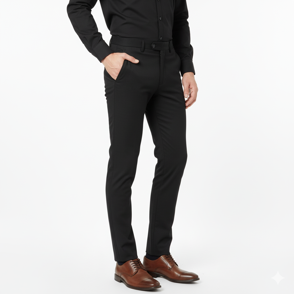 Timeless black slim-fit trousers with a crisp crease and premium finish — designed for a sleek, confident look at work or formal events.