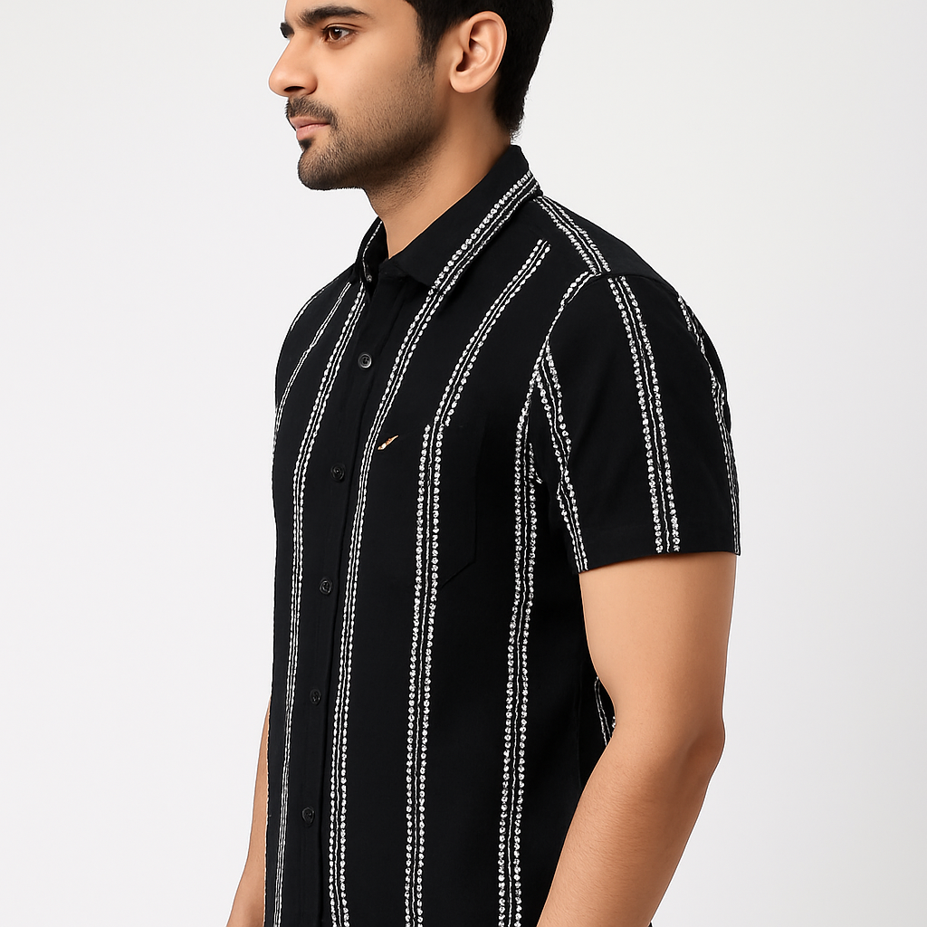 Elevate your style with this bold black shirt featuring striking vertical white patterned stripes. The slim-fit design with full sleeves and a button-down front adds a modern touch, while the crisp collar and chest pocket make it versatile for both casual outings and semi-formal occasions.