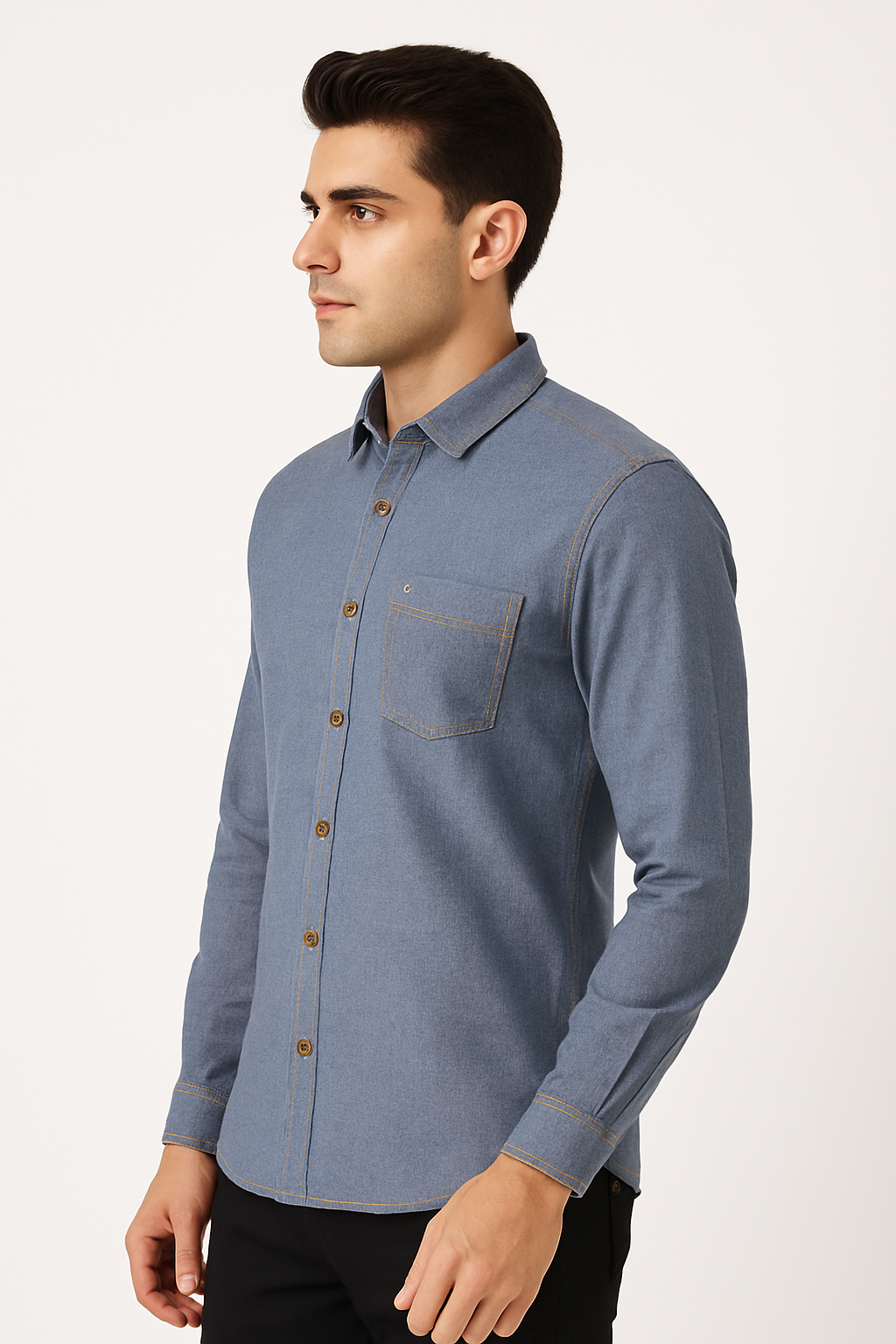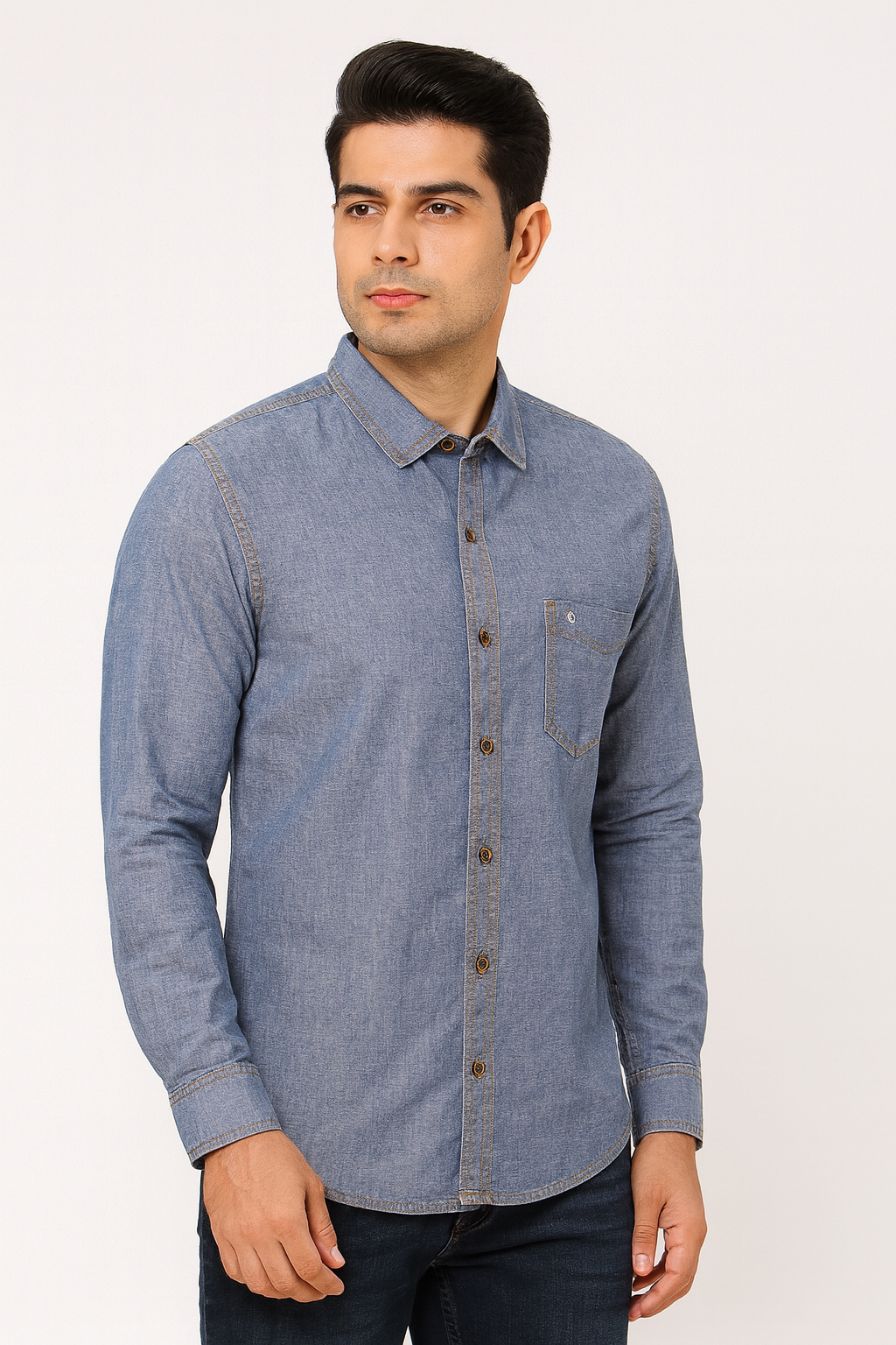 Blue denim casual shirt with chest pocket and contrast stitching.