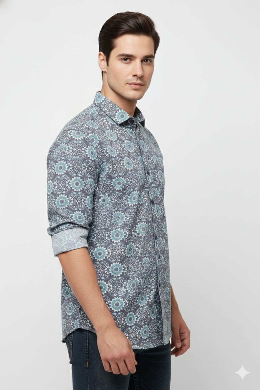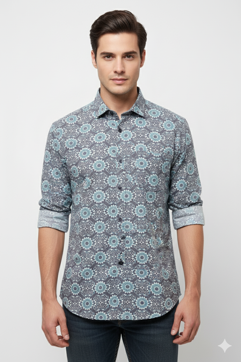 Stand out in style with this blue geometric floral printed shirt for men. Made from soft, breathable cotton, it offers all-day comfort while keeping you fashion-forward. The shirt features an intricate floral pattern in soothing shades of blue and white, giving it a refined yet vibrant appeal. With full sleeves, a classic collar, and a button-down front, it’s ideal for adding a touch of sophistication to your everyday look. Pair it with jeans or chinos for a smart casual outfit that transitions seamlessly from day to evening.