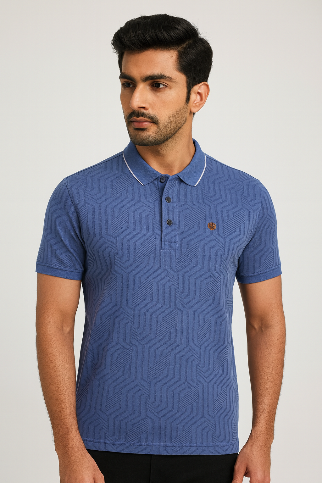 A premium blue polo t-shirt with a geometric textured pattern and contrast collar piping, offering a perfect balance of comfort and sophistication.