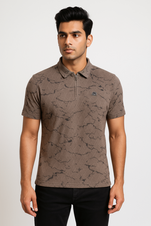 Men’s Brown Marble‑Print Zip‑Placket Polo T‑Shirt