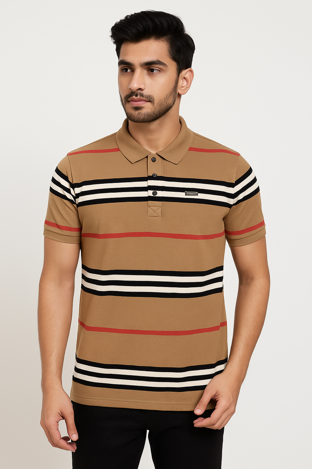 Make a bold statement with this Camel Brown Multi-Stripe Polo T-Shirt, designed to combine classic appeal with modern style. Crafted from premium cotton-blend fabric, this polo ensures maximum comfort and breathability for everyday wear. The horizontal stripe pattern in black, white, and red adds a stylish edge, while the three-button placket and ribbed collar maintain a timeless polo silhouette. Perfect for casual outings, weekend getaways, or semi-formal gatherings, this t-shirt offers versatility and sophistication in equal measure.