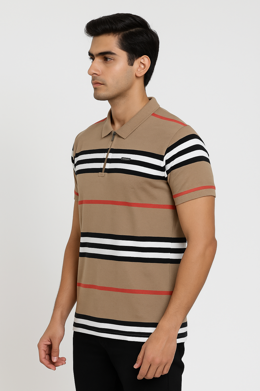 Men’s Camel Brown Multi-Stripe Polo T-Shirt
