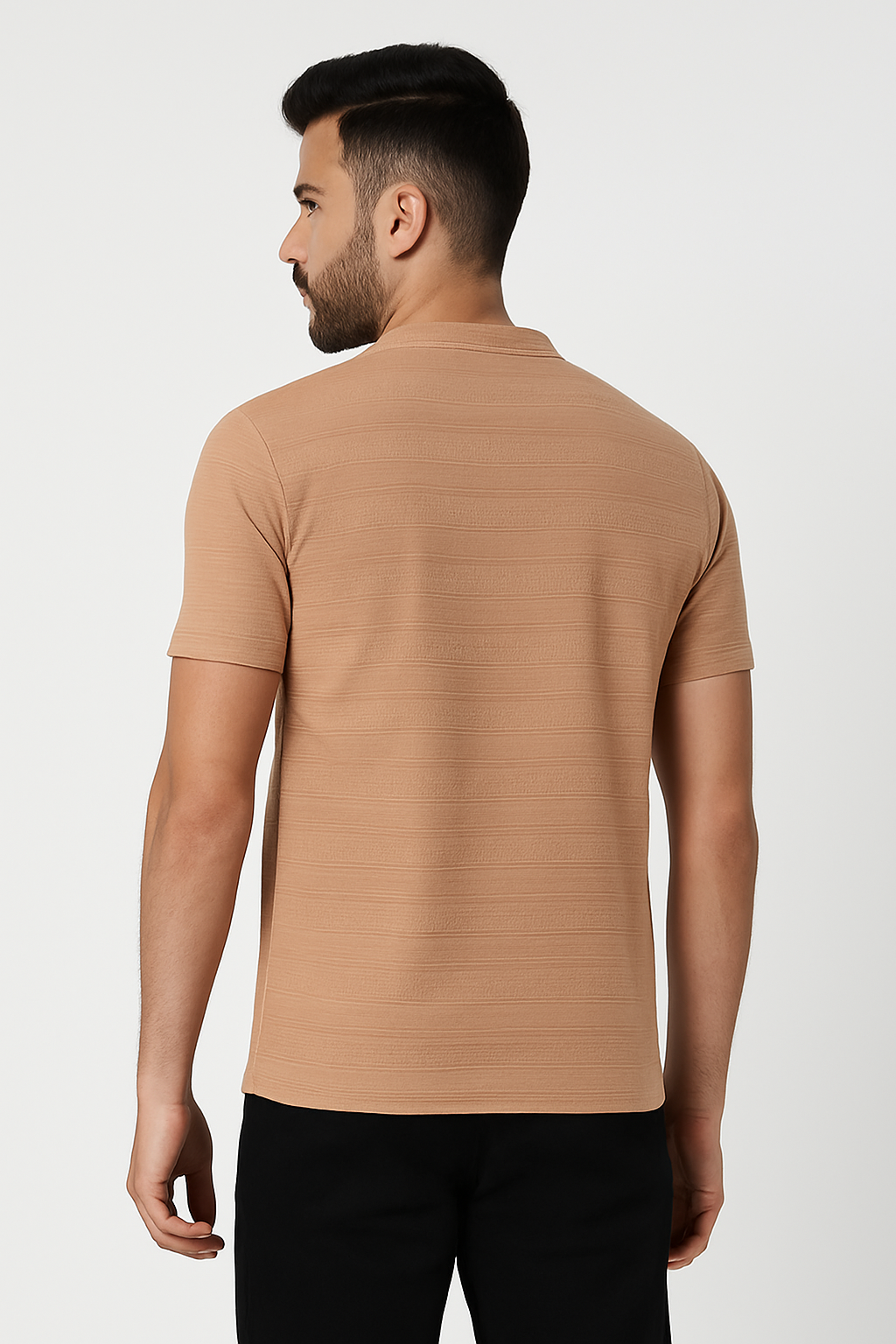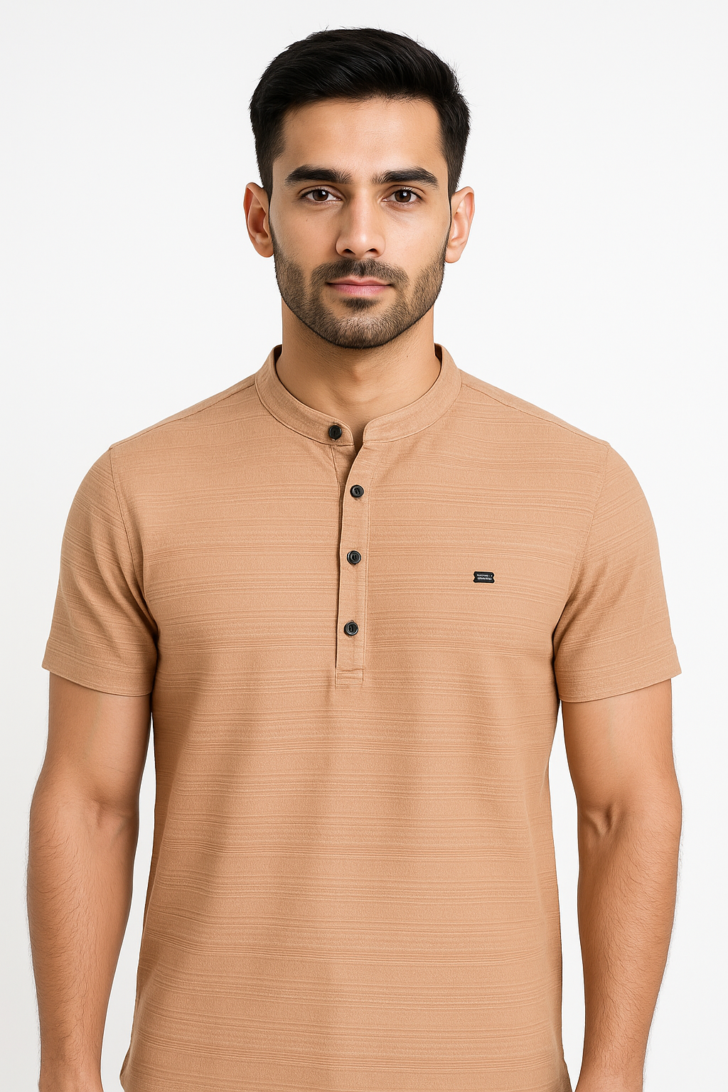 A modern camel Henley featuring a sleek mandarin collar, extended four‑button placket, and a subtle tonal texture. Crafted from a soft, breathable knit in a comfortable regular fit, it delivers effortless smart‑casual style for workdays and weekends