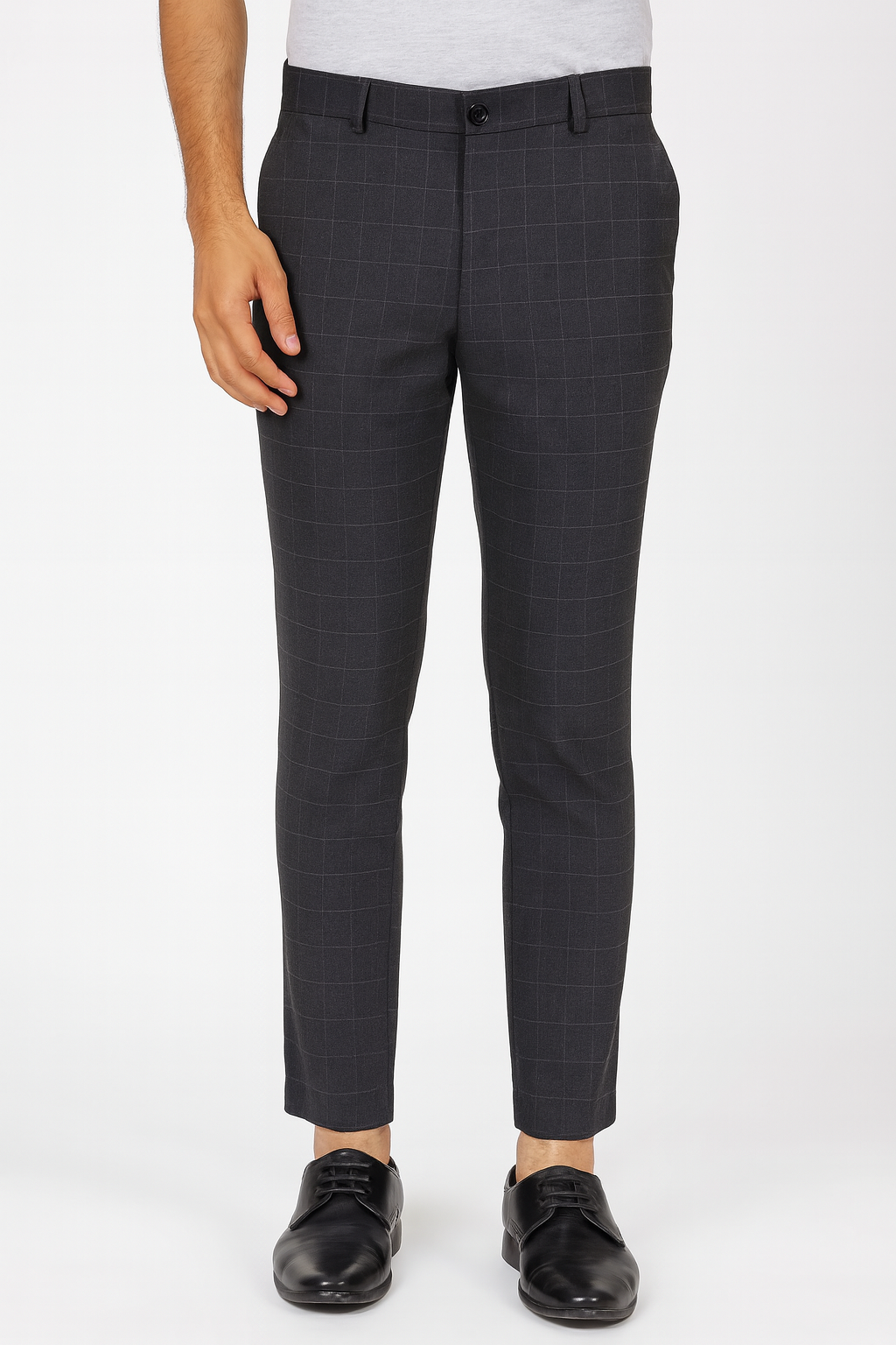Slim-fit charcoal trousers with a subtle windowpane check—perfect for modern formalwear, office dressing, or smart casual styling.