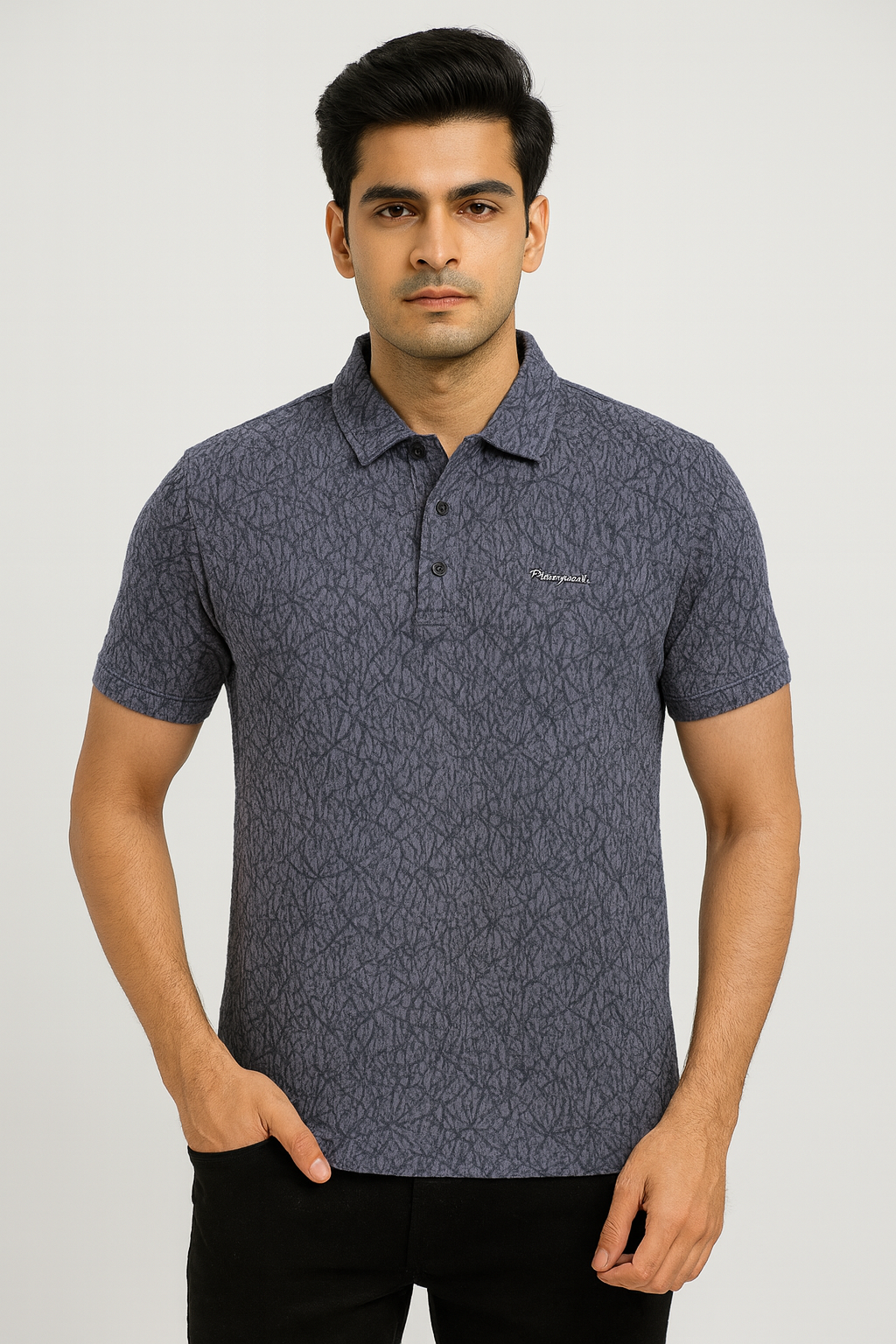 Upgrade your casual wardrobe with this stylish charcoal grey patterned polo t-shirt. Tailored from a soft and breathable cotton-blend fabric, it delivers both comfort and durability. The shirt features an intricate all-over abstract pattern that adds depth and visual interest, while the small embroidered logo on the chest lends a polished finish. A classic polo collar and a three-button placket complete its refined look, making it ideal for both casual Fridays and weekend outings.