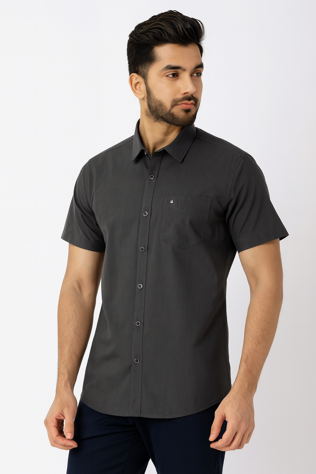 Elevate your wardrobe with this men’s charcoal grey solid short sleeve shirt. Featuring a crisp button-down design, this shirt is crafted from premium breathable fabric that ensures comfort while maintaining a sharp look. The tailored fit, classic spread collar, and neatly stitched chest pocket with a button detail make it perfect for both casual and semi-formal occasions. Its versatile grey tone pairs seamlessly with chinos, jeans, or trousers, making it a timeless staple for modern wardrobes. Whether for office wear, evening outings, or weekend get-togethers, this shirt keeps you stylish with minimal effort.