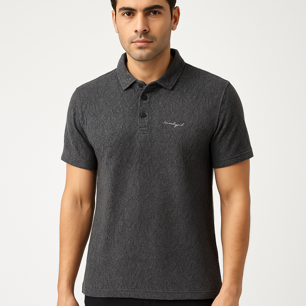 Stylish charcoal polo t-shirt with subtle textured pattern and embroidered chest detail.