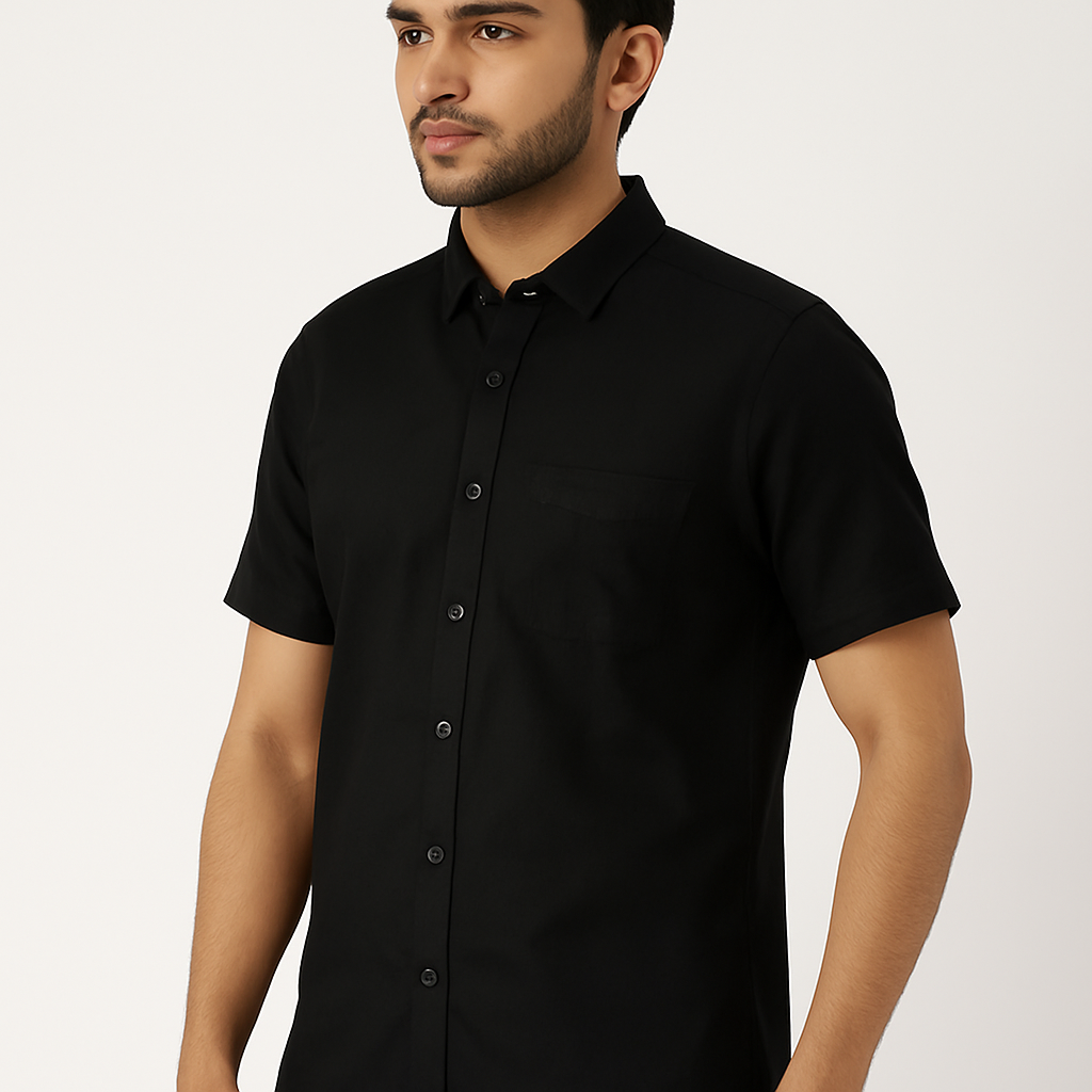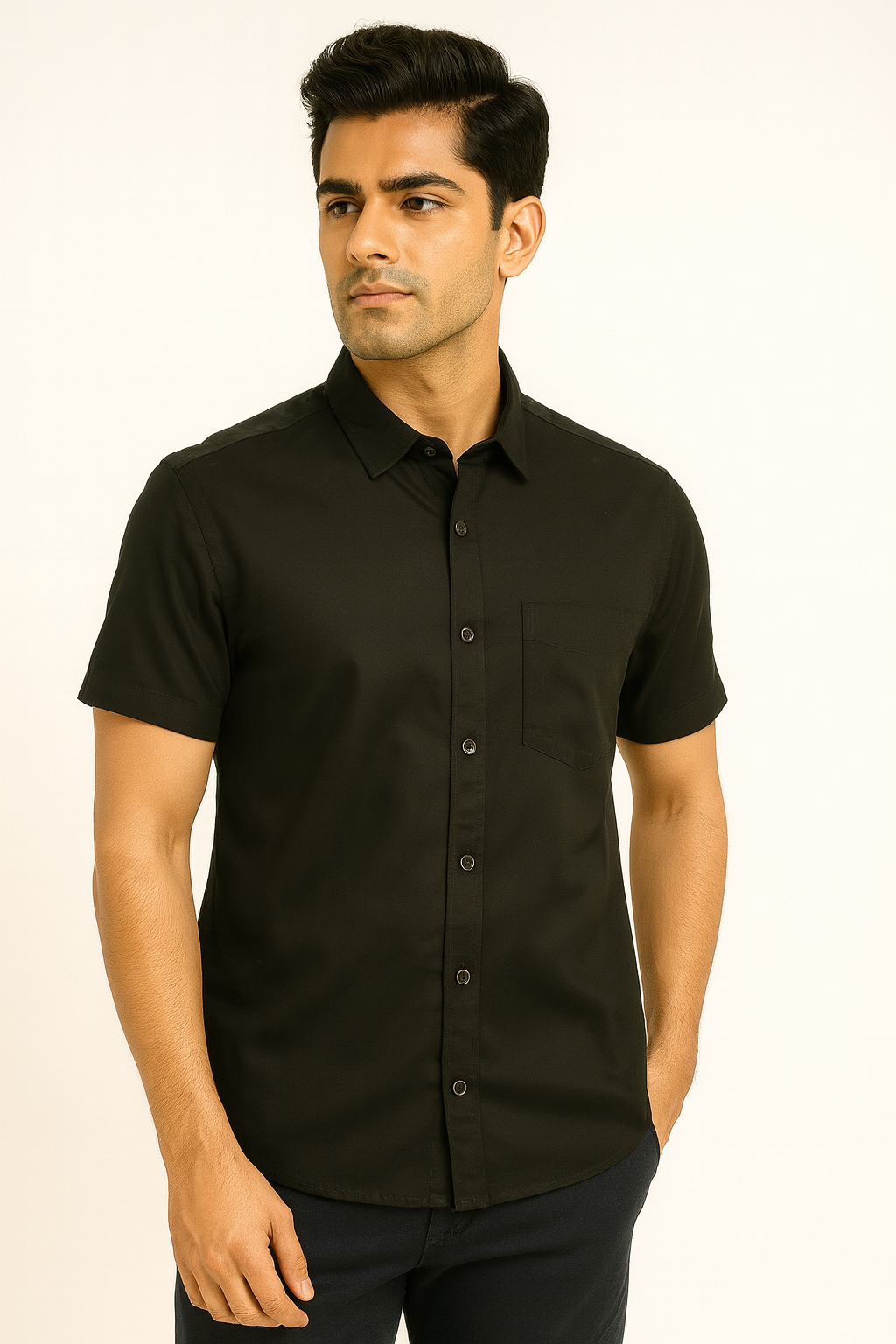 Elevate your wardrobe with this classic black short sleeve shirt, designed for both versatility and style. Featuring a crisp spread collar, button-down closure, and a chest pocket, this shirt blends timeless sophistication with modern comfort. The solid black design makes it a wardrobe essential, perfect for casual evenings, office wear, or smart-casual occasions. Crafted from breathable, lightweight fabric, it offers a polished look that transitions seamlessly from day to night.