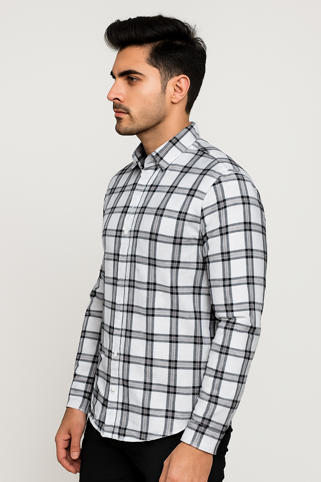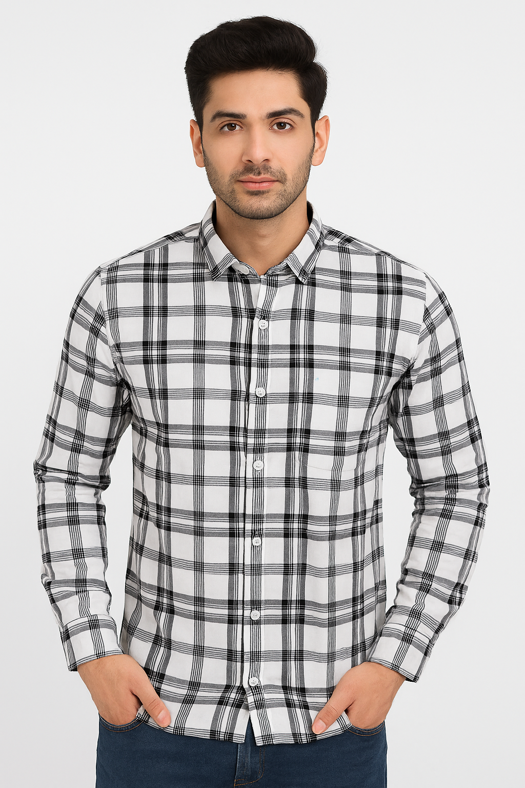 Classic black-and-white checkered slim-fit cotton shirt with full sleeves—comfortable, stylish, and perfect for both casual and semi-formal wear.