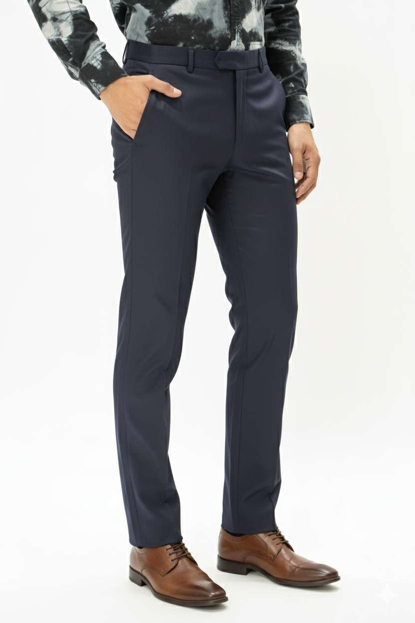 Sharp navy blue slim-fit trousers — a wardrobe essential combining comfort, versatility, and timeless elegance.