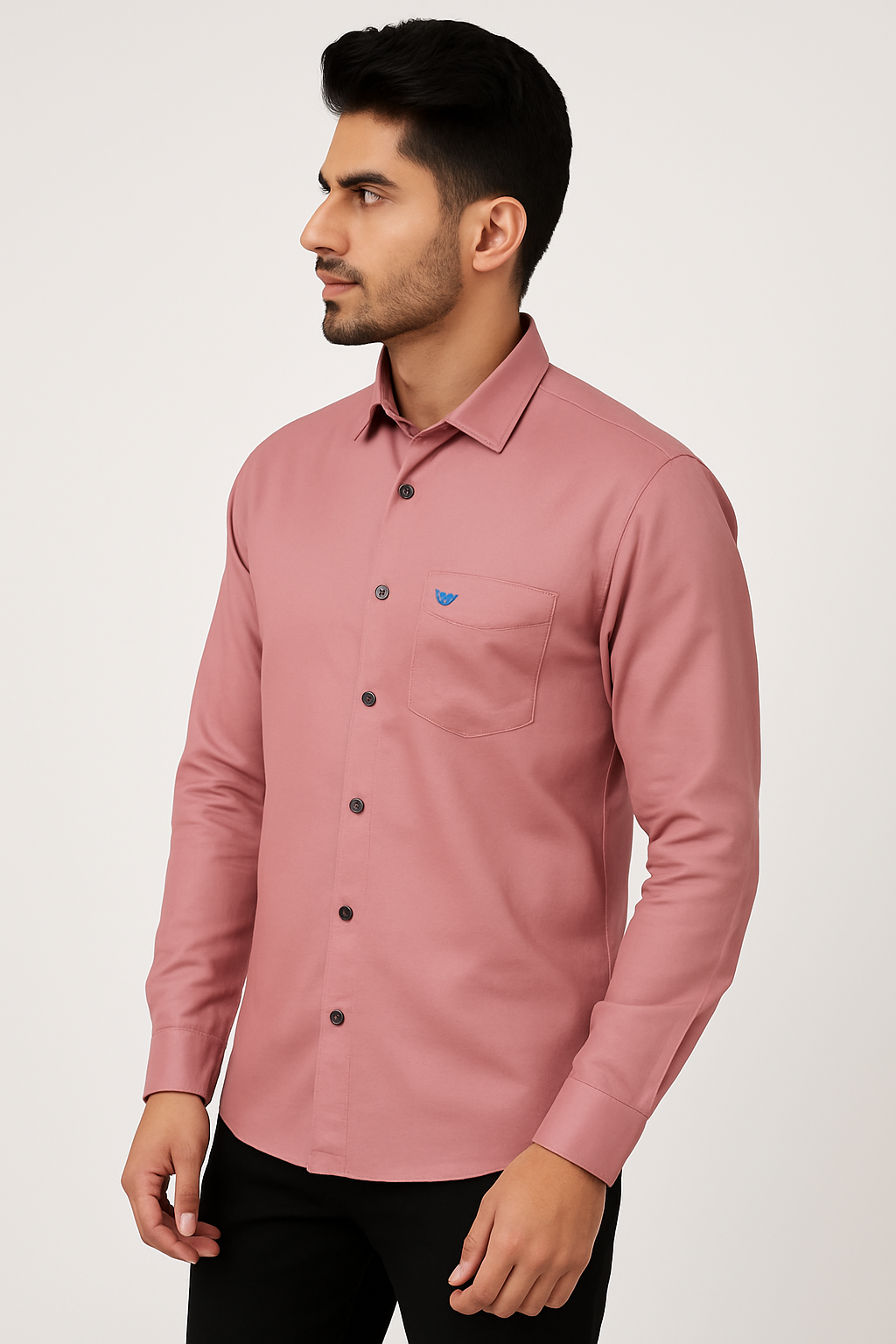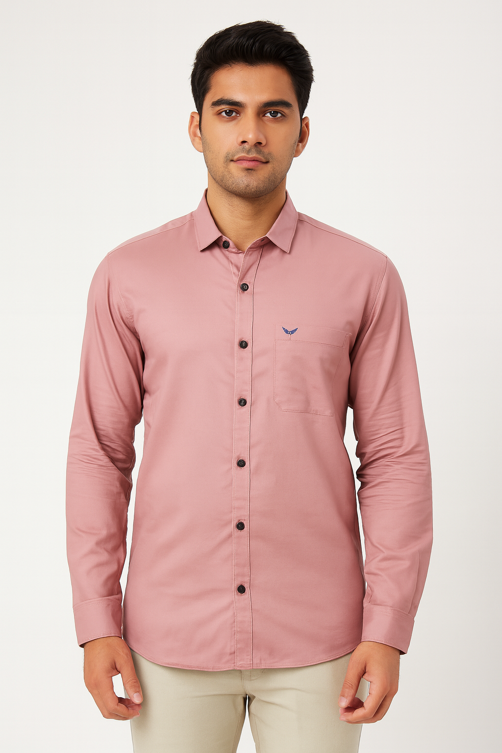 A stylish solid pink shirt crafted for modern sophistication. Featuring a clean full-button placket, black contrast buttons, chest pocket with embroidered logo, and long sleeves, this shirt is perfect for both formal and semi-casual occasions. Designed for men who like to stand out with subtle elegance.