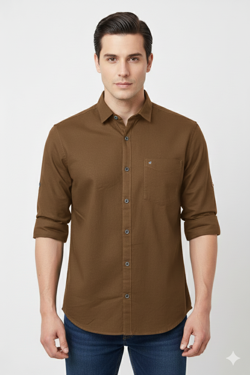 A sophisticated coffee brown full-sleeve cotton shirt with a button-down closure, roll-up sleeve tabs, and a chest pocket. Ideal for both casual and semi-formal occasions.