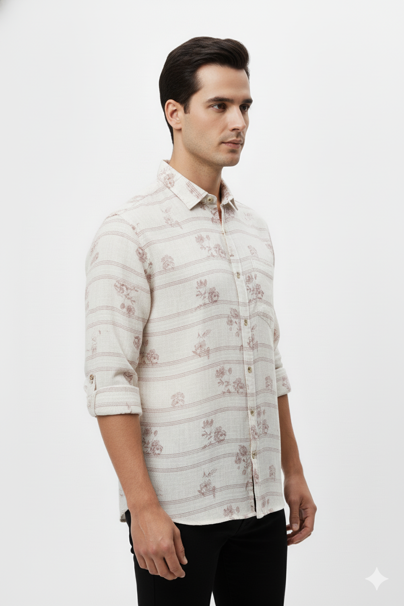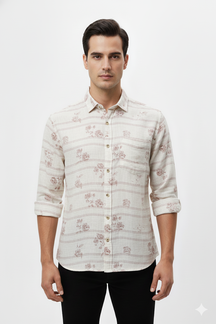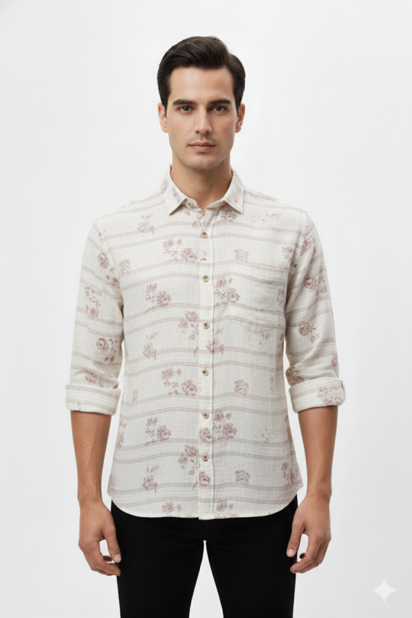 This men’s cream floral stripe shirt blends classic elegance with modern comfort. Designed with delicate maroon floral motifs set against soft horizontal stripes, it creates a balanced and stylish aesthetic. The shirt is made from breathable, lightweight fabric, offering all-day ease whether worn for casual gatherings or semi-formal events. It includes a button-down front, long roll-up sleeves, and a neat collar for versatile styling. Pair it with beige chinos or dark jeans to achieve a sophisticated yet relaxed appearance.