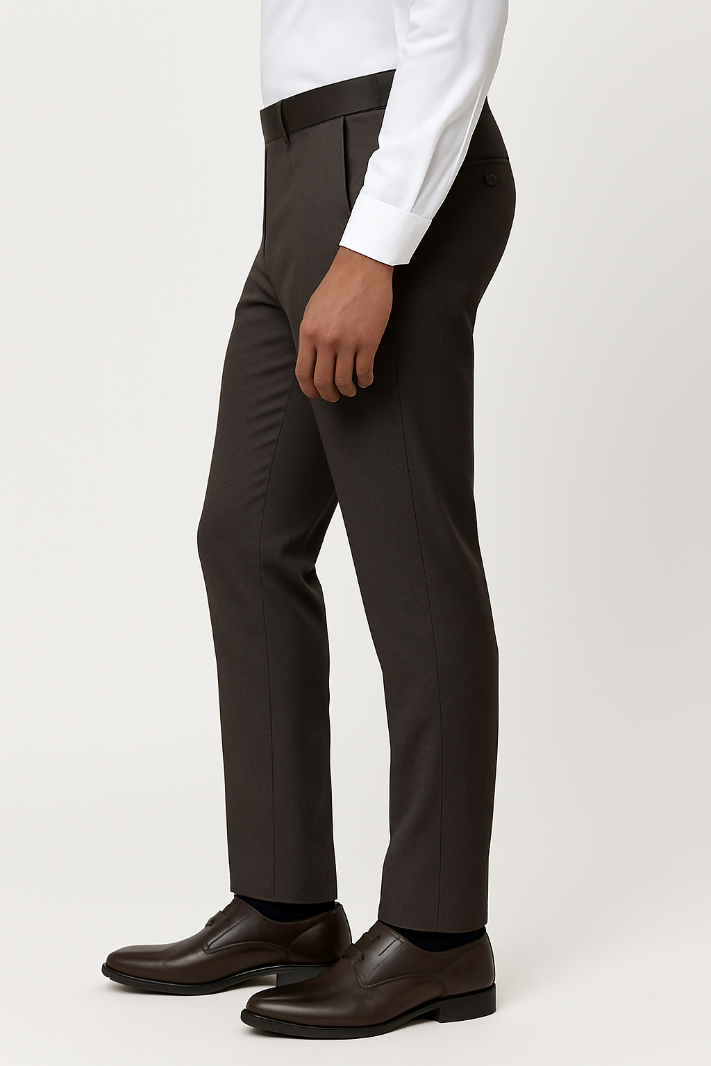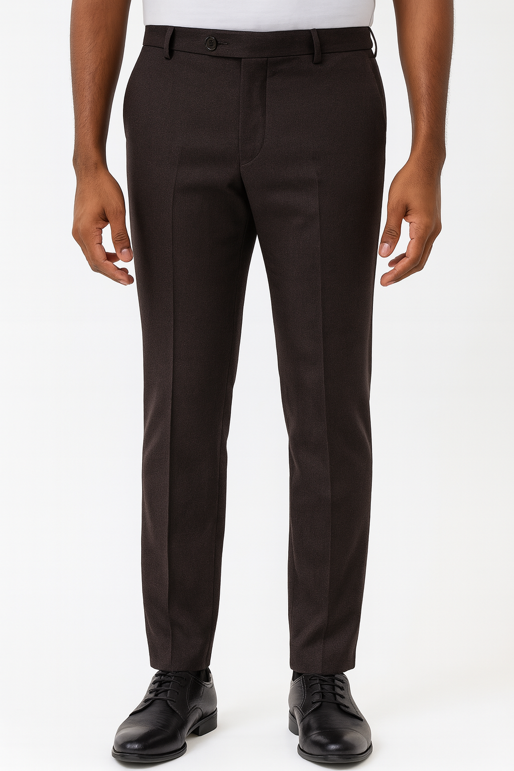 Tailored dark brown slim-fit trousers crafted from a smooth, structured fabric—ideal for office wear, formal events, and refined everyday style.