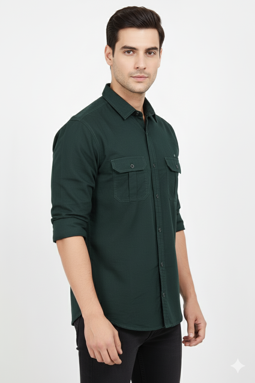 A premium dark green cotton shirt featuring dual flap pockets and a clean, structured look—perfect for casual or smart-casual occasions.