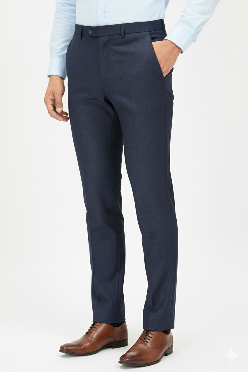 Elegant deep navy blue slim-fit trousers with fine texture — crafted for comfort, class, and modern professionalism.
