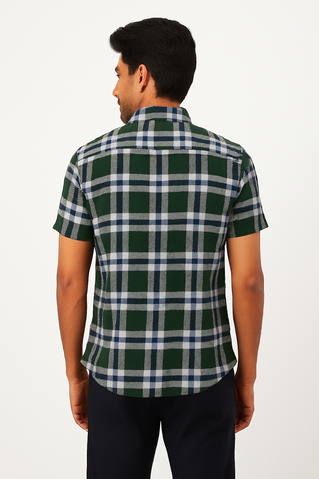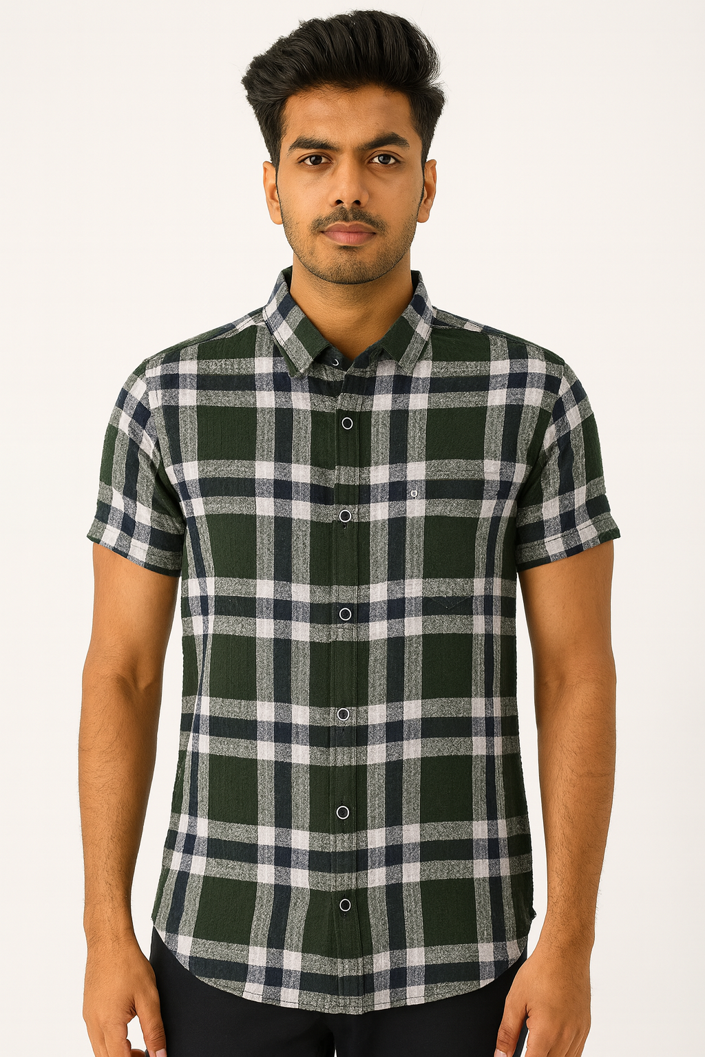 Refresh your wardrobe with this men’s green and grey checkered short-sleeve shirt. Designed with a bold plaid pattern, this shirt brings a rugged yet stylish look that’s perfect for casual outings, weekend gatherings, or relaxed office days. Made from soft, breathable fabric, it ensures all-day comfort while maintaining a sharp appearance. Featuring a full button-up closure, neat collar, and chest pocket, it combines functionality with laid-back charm. Pair it with jeans or chinos for an effortless everyday outfit.