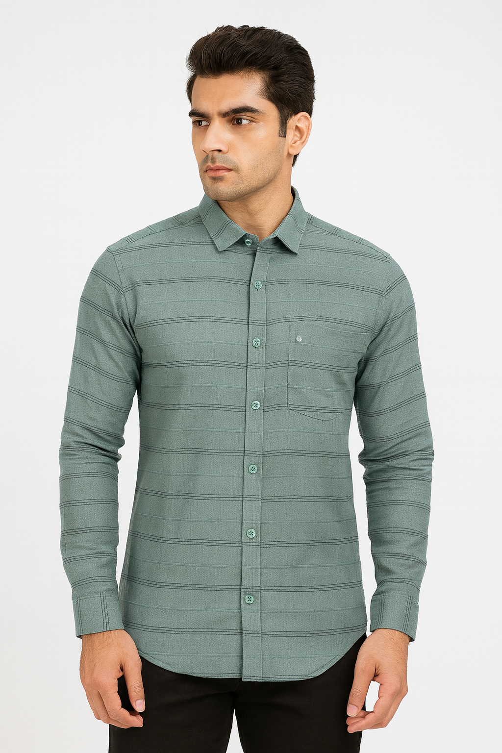 Green full sleeve shirt with textured horizontal stripes and chest pocket.