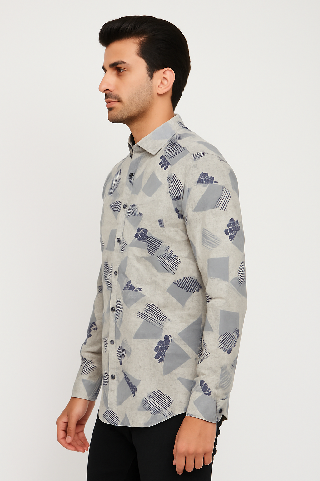 Trendy men’s grey cotton shirt featuring a unique abstract geometric print in shades of grey and navy blue. Designed for comfort and modern style — perfect for casual and semi-formal wear.