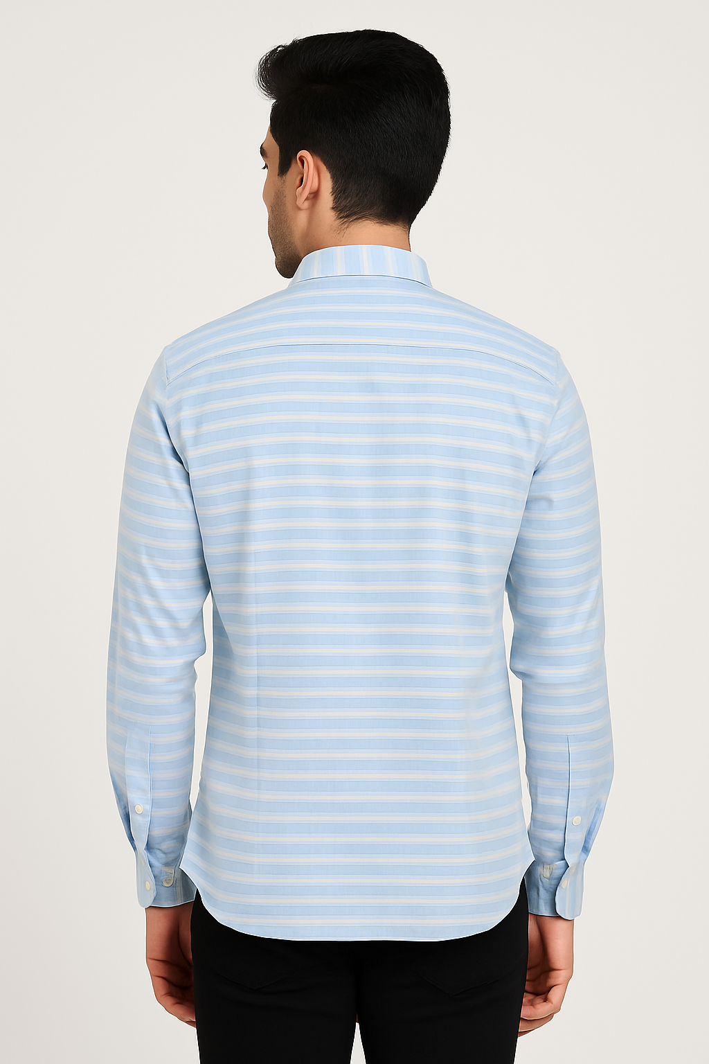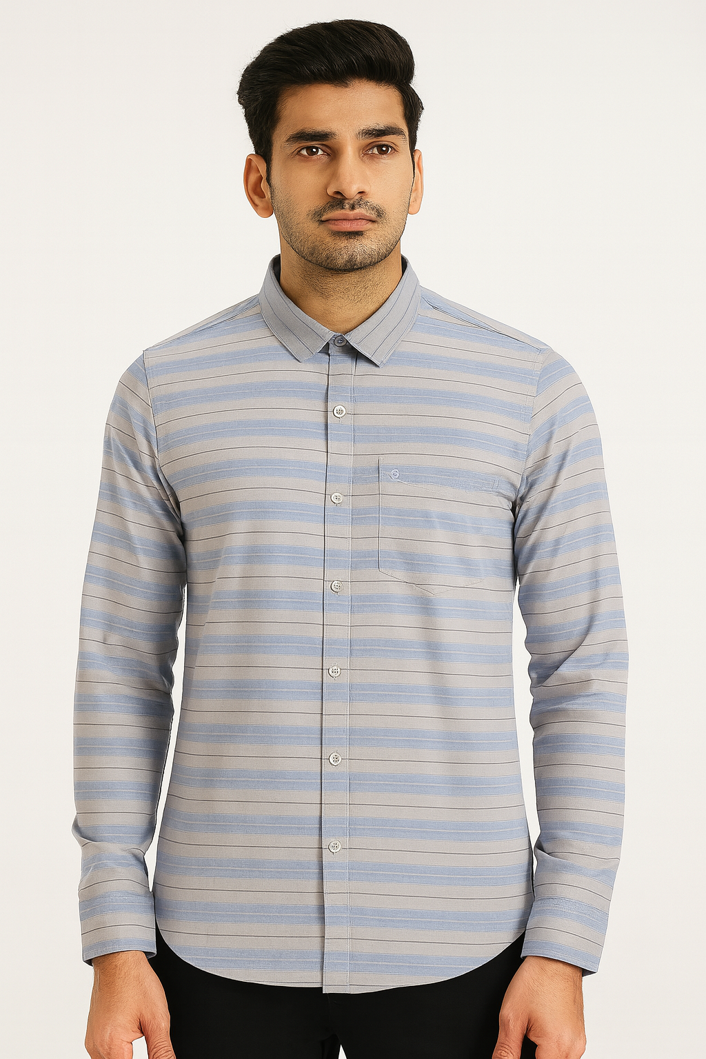 Elevate your casual look with this grey and blue striped shirt. Featuring soft horizontal stripes, this shirt offers a relaxed yet stylish appeal. Designed with a slim fit, buttoned cuffs, and a neat collar, it pairs effortlessly with jeans or chinos. The chest pocket adds a practical touch, while the breathable fabric ensures comfort all day. Perfect for weekend outings or smart-casual office wear.